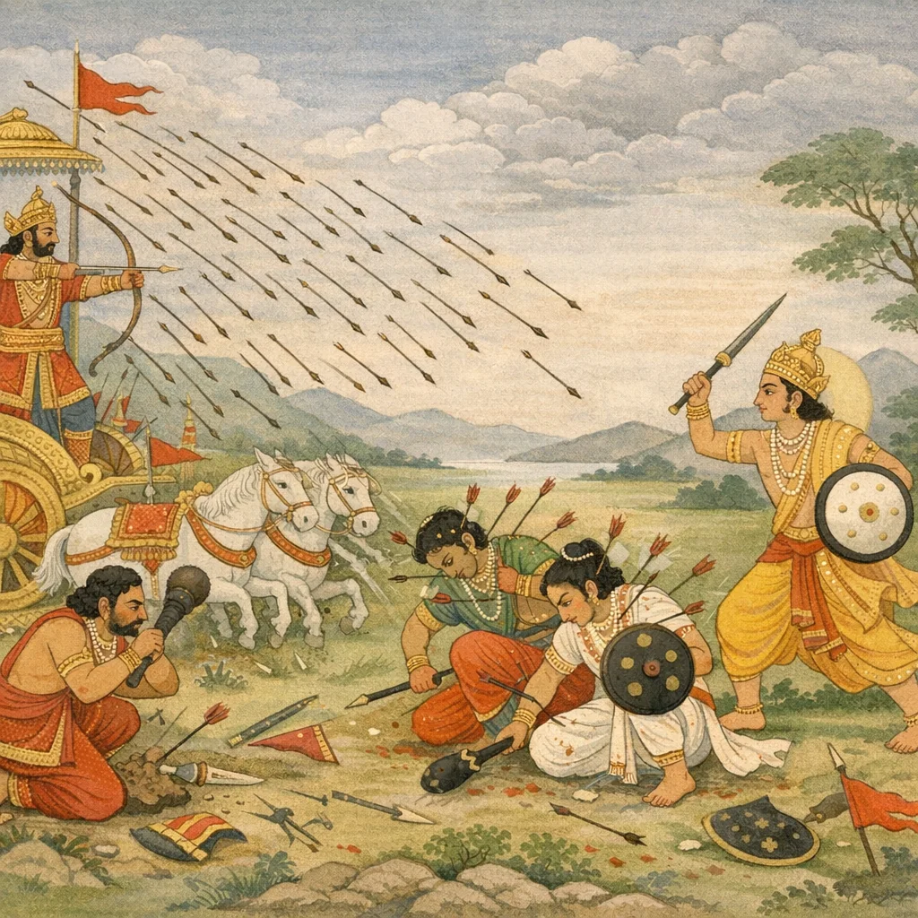 Upa-parva: Madrarāja-padānugānāṃ praskandana (After Śalya’s fall: the Madra contingent’s assault and Duryodhana’s attempted restraint)