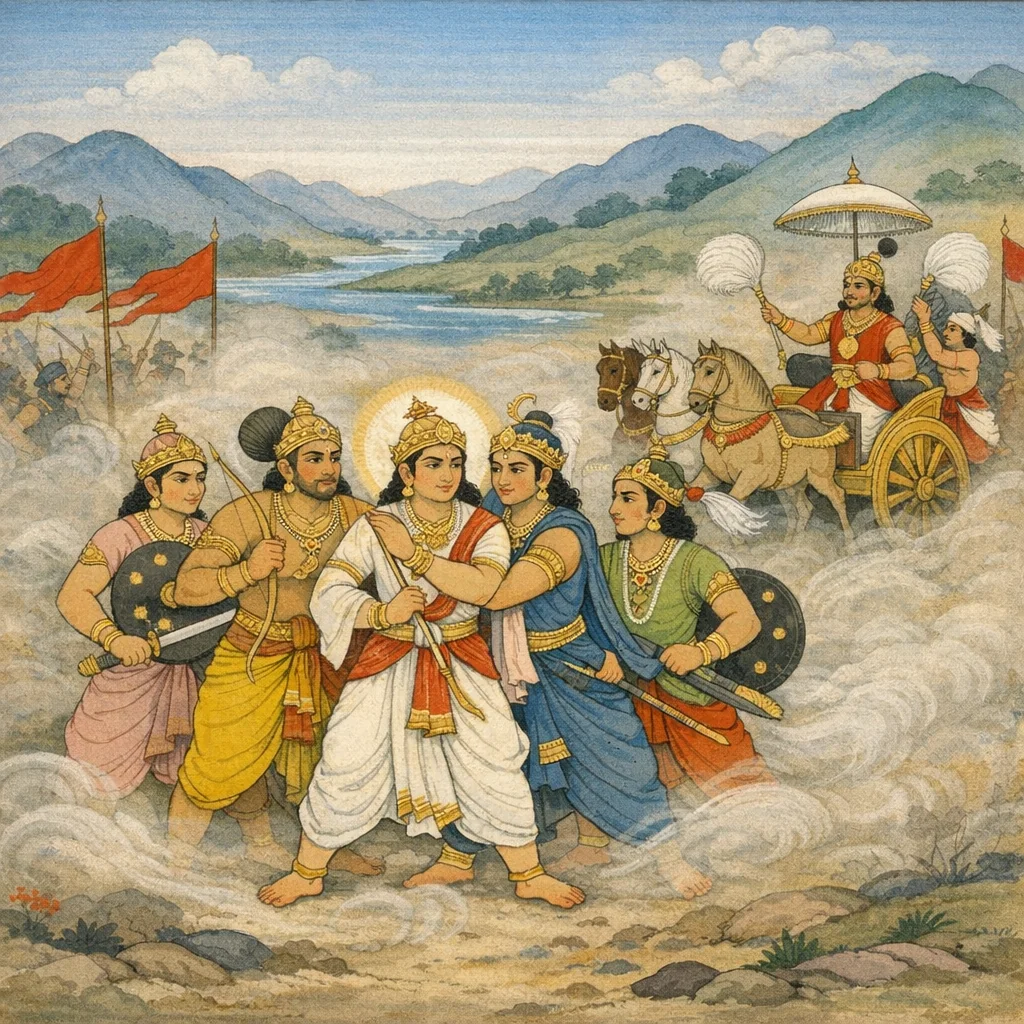 Sañjaya said: Seeking to seize Yudhiṣṭhira, the enemy forces closed in on him from every side. Then Arjuna, Bhīmasena, the sons of Mādrī—Nakula and Sahadeva—Sātyaki the lion among men, Draupadī’s five sons, Dhṛṣṭadyumna, Śikhaṇḍī, and the valiant warriors of the Pāñcālas and Somakas—all of them formed a protective ring around Yudhiṣṭhira, guarding him on all sides. Thus surrounded, the Pāṇḍavas—bulls among men—stood firm.