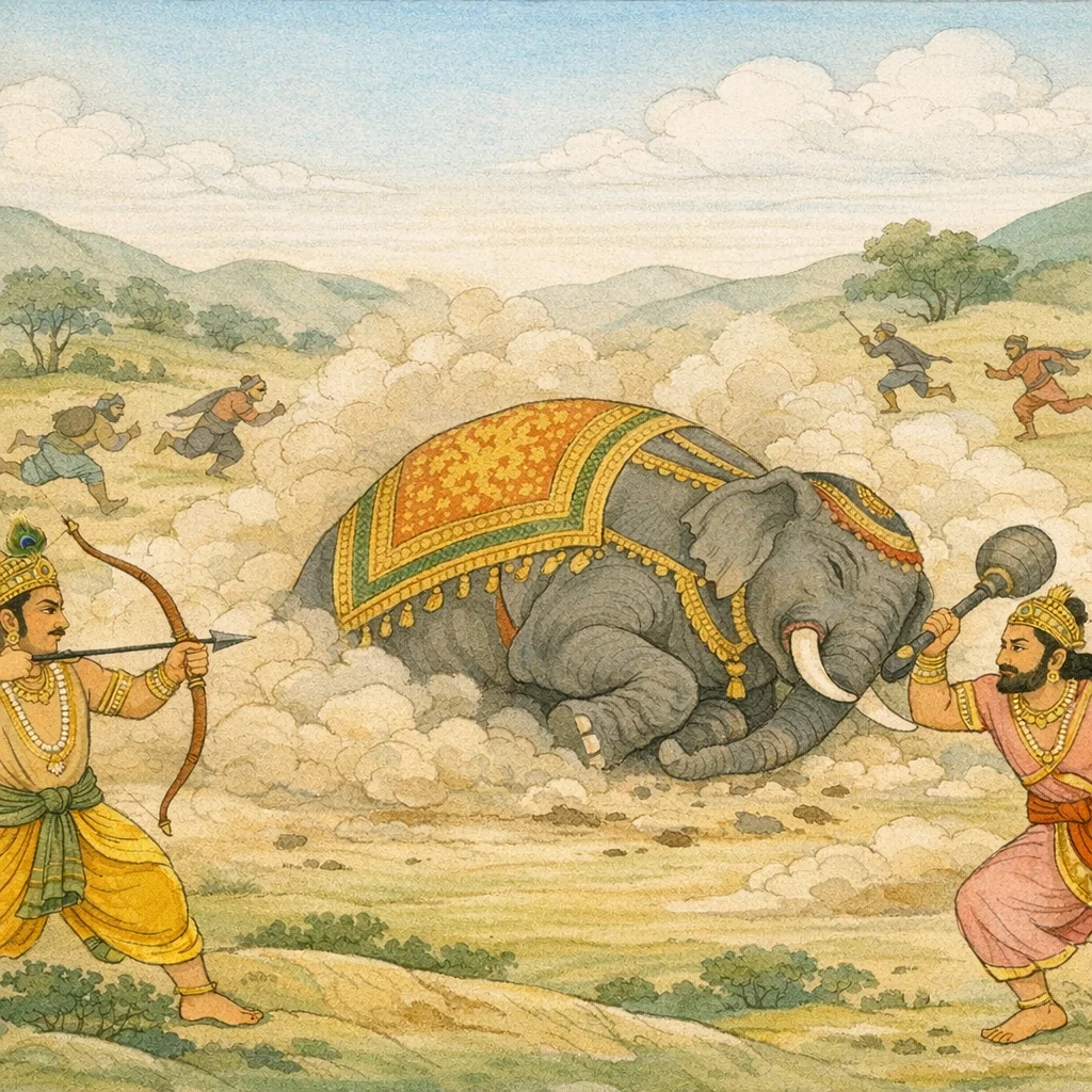 Sañjaya said: “With its temple-region split open, the elephant suddenly let out a loud cry; pouring forth copious blood from its mouth, that mountain-like lord of elephants collapsed to the ground—like a hill brought down when the earth trembles in an earthquake.”