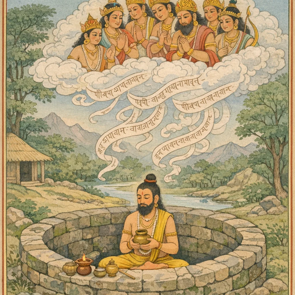 Vaiśampāyana said: “Whoever touches this well for purification will attain the blessed state of those who have drunk Soma in sacrifice.” Thus the sage, while requesting a boon from the gods, spoke: “Rescue me from this well, and grant that any person who sips water here as a rite of purification may obtain the same exalted destiny as the Soma-drinkers in a yajña.”