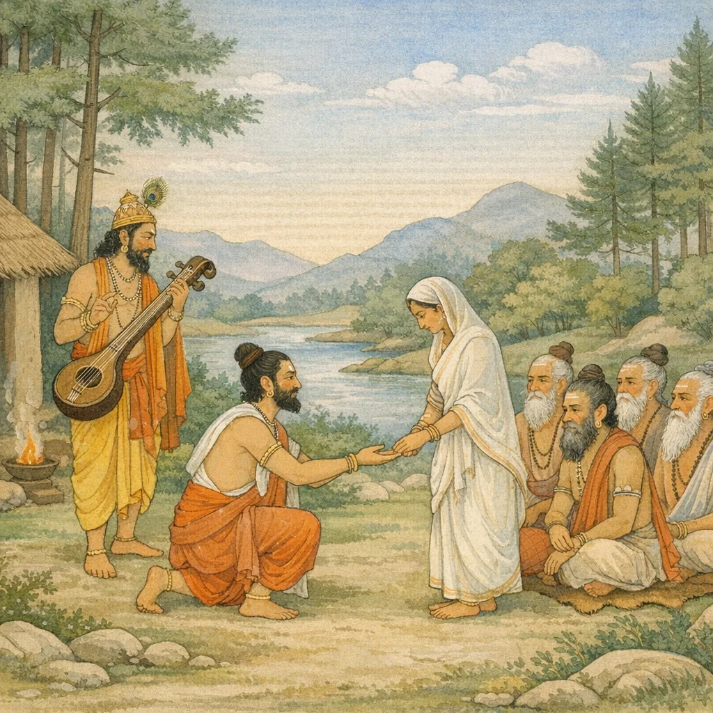 Vaiśampāyana said: “I shall grant half of my ascetic merit to the worthiest man who takes my hand in marriage.” Hearing this, Nārada’s daughter came into the assembly of sages and declared: “O crest-jewel among the virtuous! Whoever among you accepts my hand, to him I will give half the fruit of my austerities.”