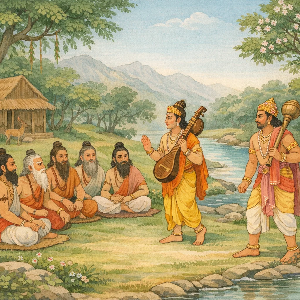 Vaiśampāyana said: “O King, the great ascetic Nārada appeared bearing a golden staff and a water-pot; and he also held the delightful vīṇā called Kacchapī, whose sound is pleasing.” The scene underscores the authority of a sage whose spiritual discipline and sacred music together signal counsel meant to steady minds amid the turmoil of war.