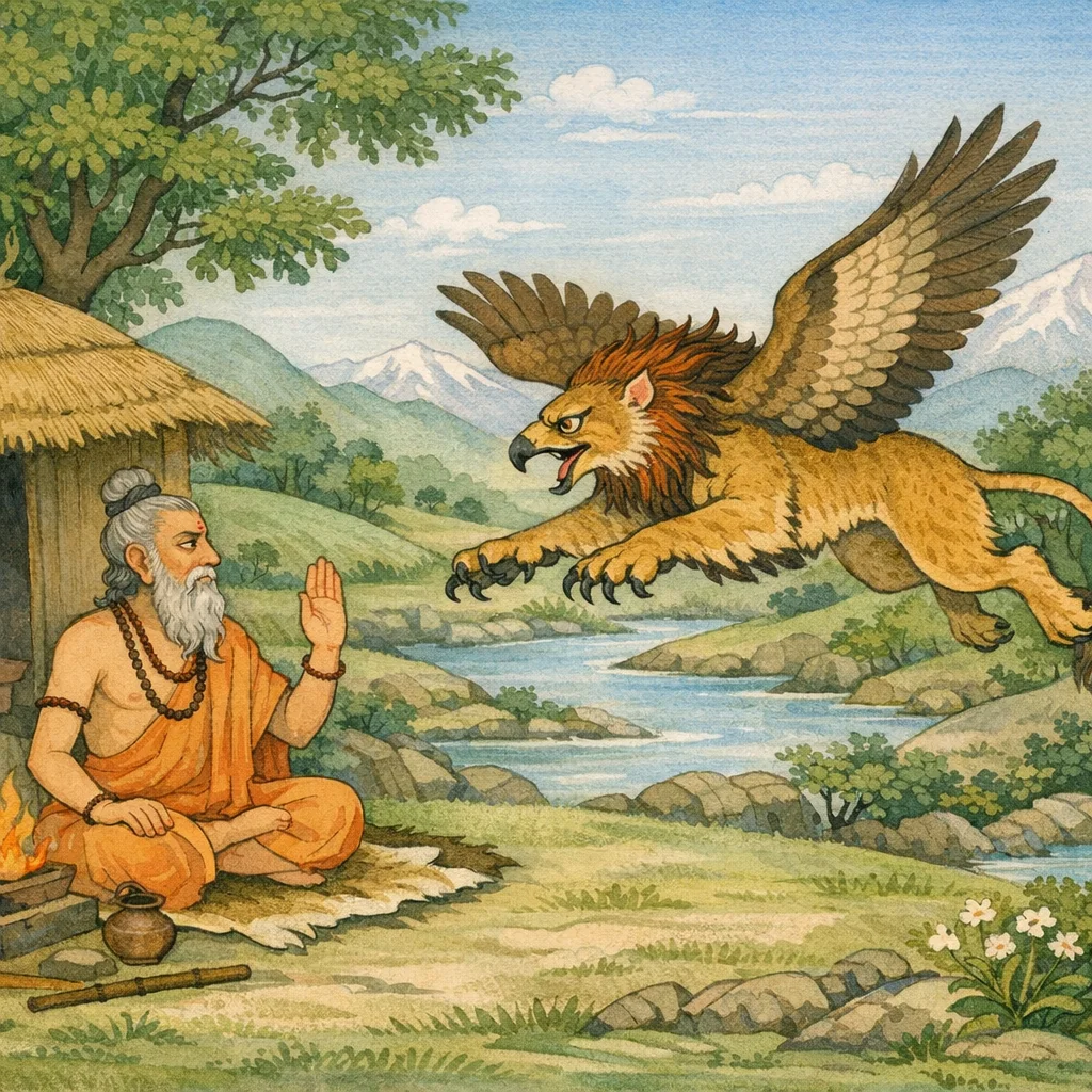 Bhishma said: An extraordinary śarabha, a forest-ranging beast with eight feet and eyes set upward, came to the sage’s dwelling intending to kill that lion. A violent predator, it spread fear among the creatures of the woods as it approached the hermitage, bringing the threat of bloodshed into a place meant for peace and restraint.