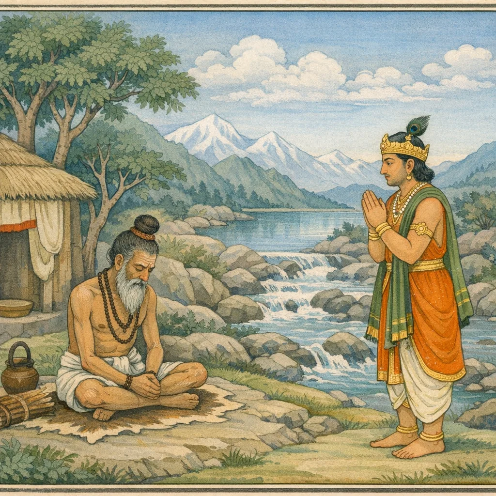 Chapter Arc: भीष्म युधिष्ठिर से कहते हैं—हे राजशार्दूल, एक समय तीर्थ-यात्रा करते हुए मैं दिव्य नर-नारायण आश्रम पहुँचा, जहाँ बदरीवन, वैहायस-ह्रद और वेदपाठी अश्वशिरा की पवित्र उपस्थिति है। → आश्रम-परिसर में एक कृश, भयभीत ब्राह्मण को देखकर कथावाचक-राजा (भीष्म के स्मरण में) विचलित होता है; उसके असामान्य भय और दीनता के पीछे छिपे कारण को जानने की उत्कंठा बढ़ती है। तनु मुनि ध्यानमग्न होकर राजा की बात सुनते हैं और मौन-गंभीरता से प्रसंग को धर्म-कारण की ओर मोड़ते हैं। → तनु मुनि निर्णायक कारण बताते हैं—राजन्, तुम्हारे पुत्र ने पूर्व में मूढ़-बुद्धि के वशीभूत होकर अपने दुर्भाग्य से एक पूजनीय महर्षि का अपमान किया था; उसी अपराध का फल आज भय, पतन और क्लेश के रूप में प्रकट है। → नर-नारायण आश्रम की मर्यादा, वैहायस-कुण्ड में स्नान, देव-पितृ तर्पण और ऋषि-संग के माध्यम से कथा प्रायश्चित्त, विनय और धर्म-शुद्धि की दिशा दिखाती है—अपराध का मूल अहंकार है और उसका उपचार श्रद्धा, क्षमा-याचना तथा सत्संग है।