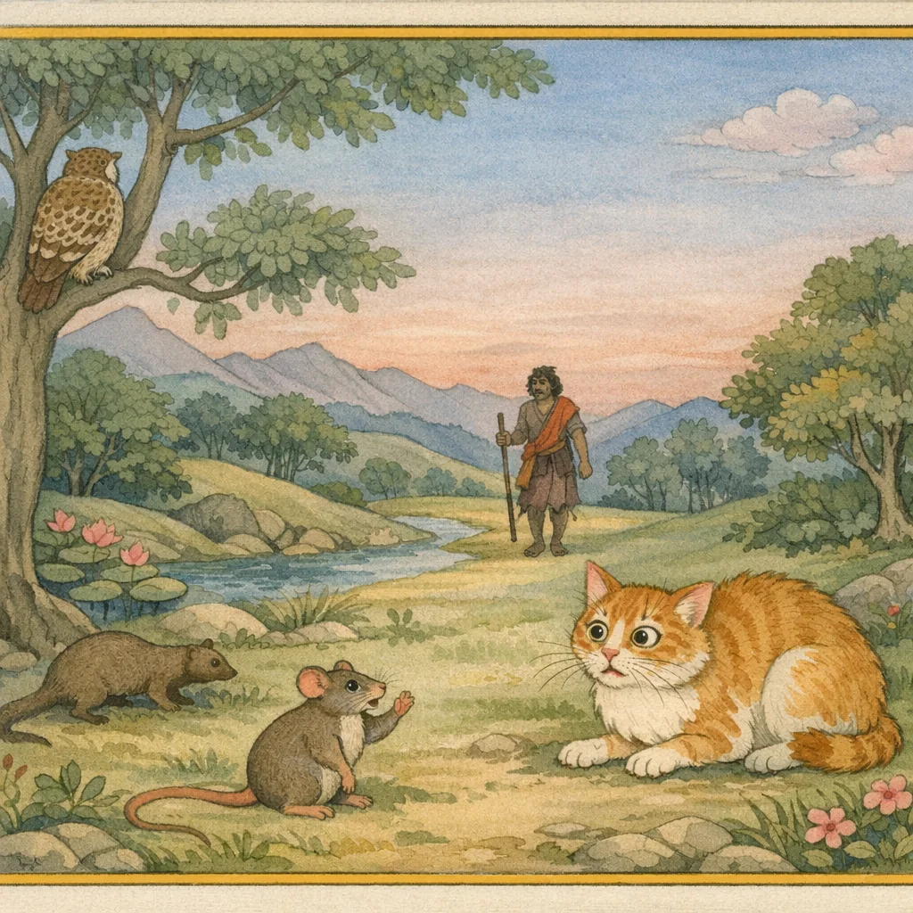 Here too, the learned cite an ancient illustrative tale: the dialogue between a cat and a mouse, connected with a nyagrodha (banyan) tree. It is offered as an example to illuminate the ethical point under discussion.
