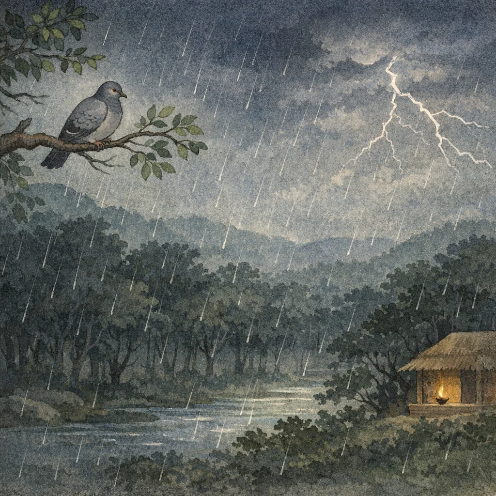 The pigeon, stricken with sorrow, lamented: “Alas! Today a mighty windstorm and heavy rain have come; yet even now my beloved wife has not returned. What cause could there be, that she has still not come back?”