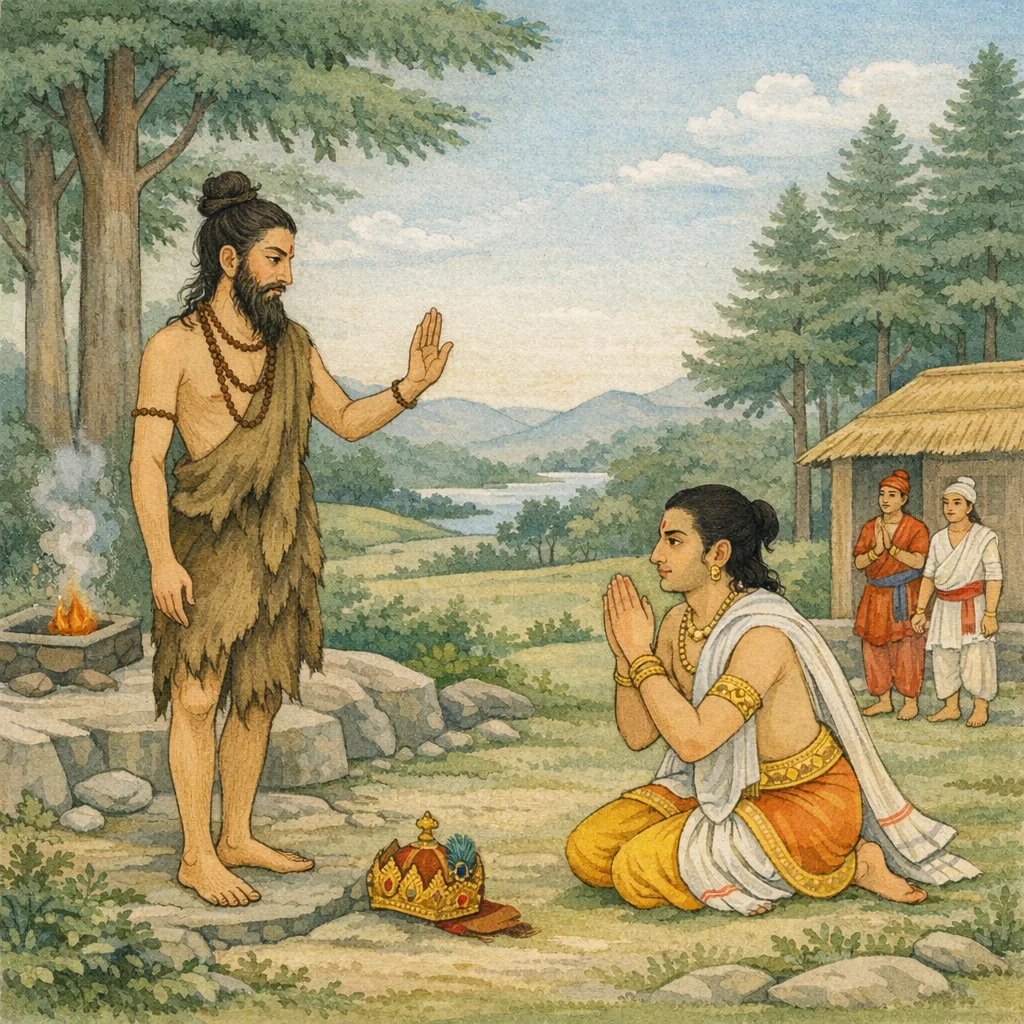 Bhishma said: “O King, the ancient account I am about to relate is one that strengthens dharma. King Janamejaya, scorched by the consequences of his own sinful deeds and wandering in the forest, came to the sage Indrota of the Shaunaka lineage, a man steadfast in austere vows.”