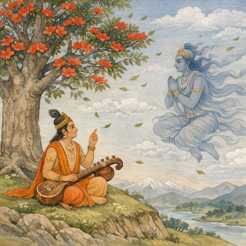Chapter Arc: नारद वायुदेव से कहते हैं कि हिमालय की पीठ पर एक परिवारवान् शाल्मलि (सेमल) वृक्ष है, जो अपने विशाल मूल और छाया के मद में तुम्हें तुच्छ समझता है और तुम्हारे विरुद्ध कटु आक्षेप करता है। → वृक्ष का अहंकार ‘बल’ के नाम पर बढ़ता जाता है—वह कहता है कि वह वायु से अधिक बलवान है और भय का कोई कारण नहीं; पर नारद के वचन और वायु की संभावित परीक्षा का संकेत उसके भीतर असुरक्षा और विचार-चक्र जगाता है। → शाल्मलि मन-ही-मन वायु द्वारा होने वाले ‘वात-कारित’ (आँधी/झंझा) परिणामों का अनुमान कर अपने को वायु के समकक्ष न पाकर टूटता है—स्वीकार करता है कि नारद के सामने कही उसकी डींगें झूठी थीं और वह वायु-बल का सामना करने में असमर्थ है। → अहंकार से उपजा ‘प्राणमात्र-बल’ (केवल देह-बल) तुच्छ ठहरता है; शाल्मलि बुद्धि/विवेक का आश्रय लेकर भय-निवारण का मार्ग खोजता है और संकेत देता है कि वन के अन्य वृक्ष भी यदि बुद्धि का सहारा लें तो वायु-कोप से ‘अरिष्ट’ (अनिष्ट) नहीं होगा। → वृक्ष का ‘बुद्धि-आश्रय’ व्यावहारिक रूप से क्या है—विनय, संयम, या किसी धर्म-नीति का पालन—यह अगले प्रसंग की ओर संकेत बनकर रह जाता है।