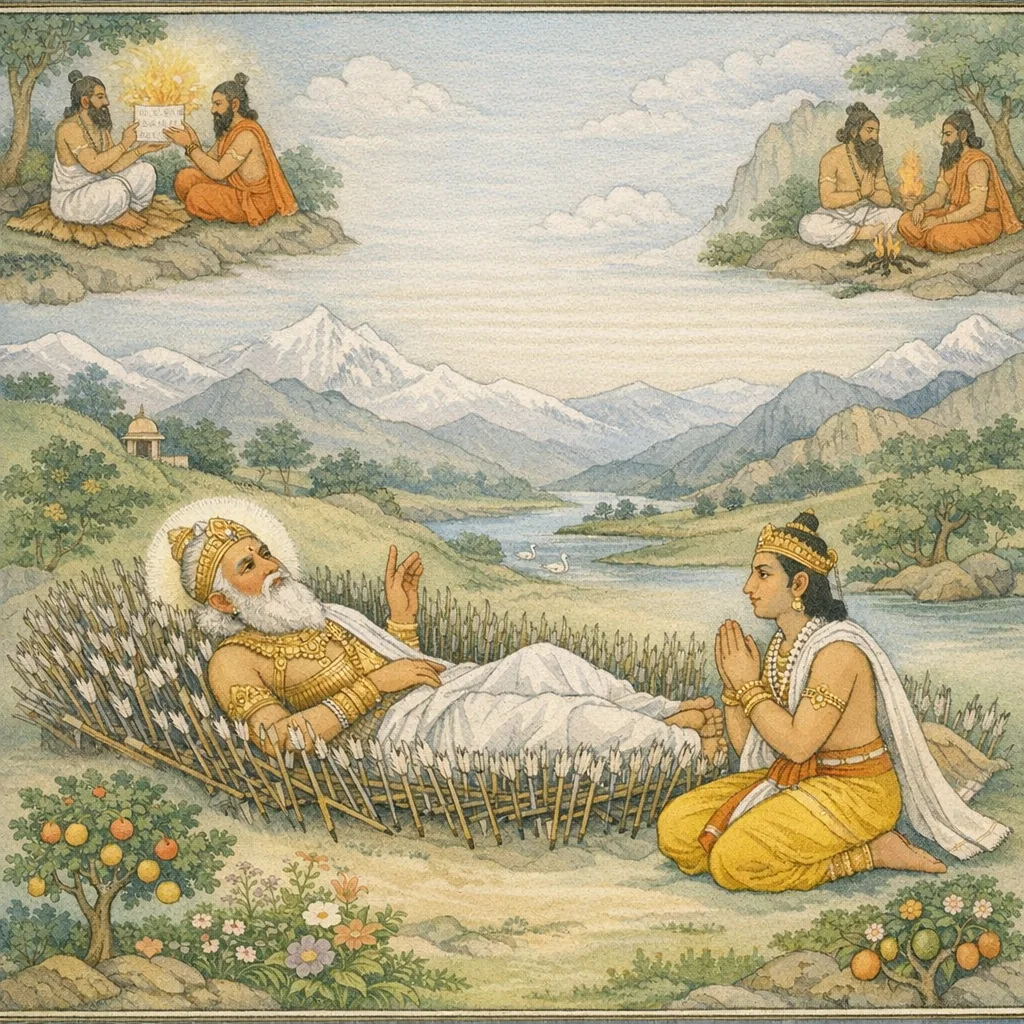 Chapter Arc: भीष्म युधिष्ठिर से कहते हैं कि समस्त कर्म-फल का मूल तप है; बिना तप के मूढ़ मनुष्य क्रिया का फल नहीं पा सकता। → भीष्म तप की सर्वव्यापक सत्ता को क्रमशः विस्तृत करते हैं—प्रजापति ने तप से सृष्टि रची, ऋषियों ने तप से वेद पाए, अन्न-फल-मूल, औषधि-आरोग्य और विविध साधन-क्रियाएँ भी तप से सिद्ध होती हैं। → तप की परिभाषा बाह्य कष्ट से ऊपर उठकर नैतिक अनुशासन में प्रतिष्ठित होती है—अहिंसा, सत्यवचन, दान, इन्द्रियनिग्रह को ‘उपवास से भी श्रेष्ठ तप’ कहा जाता है; और संन्यास को परम तप के रूप में प्रतिष्ठा मिलती है। → भीष्म निष्कर्ष देते हैं कि देवता भी तप से महत्त्व को प्राप्त हुए; इच्छित फल, यहाँ तक कि देवत्व भी, तप से निश्चित रूप से सुलभ है—तप ही साधन और सिद्धि दोनों का मूल है।