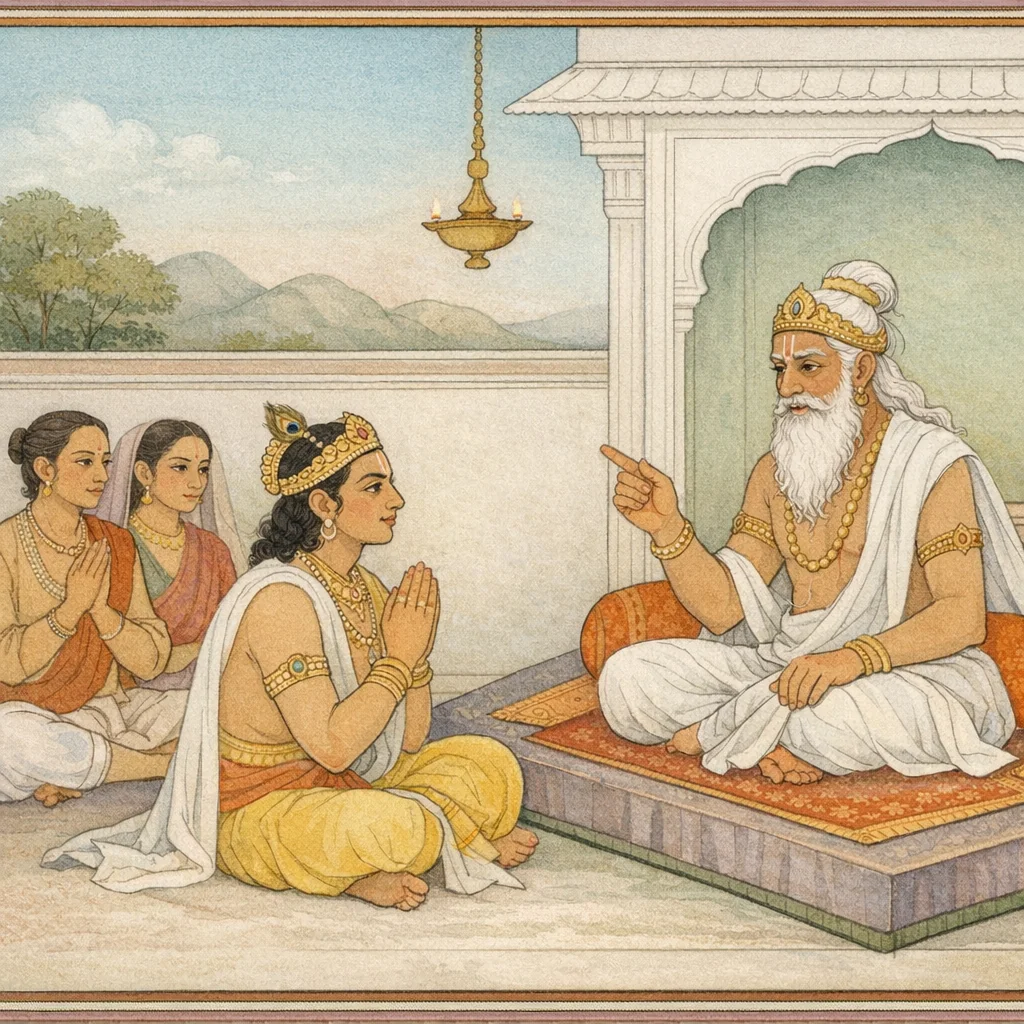 Gautama’s dilemma is the collision between acquisitiveness and ethical obligation: after accepting more wealth than he can sustain, hunger and fatigue tempt him toward harming a benefactor, testing whether need can justify betrayal and violence.