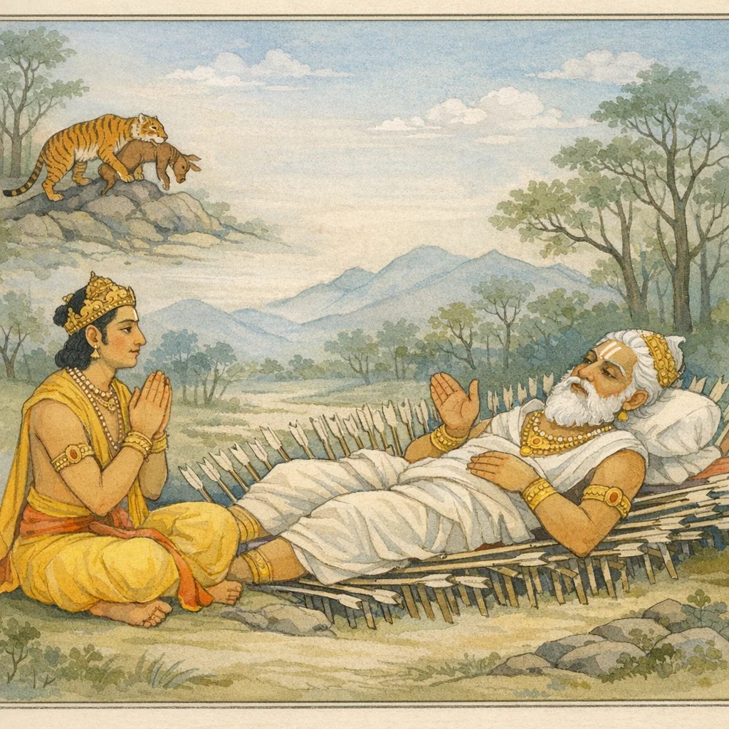 Bhishma said: “As each night passes, life grows ever shorter. When one’s lifespan is thus steadily diminished, who could truly find happiness—like a fish struggling in deep water?”