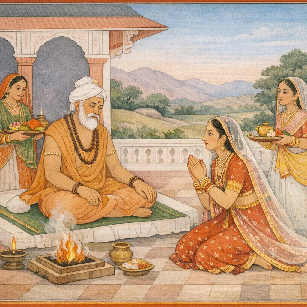 The queen, seeing her lord Janaka settled in a fearless, desireless state, confronted him in private with a pointed question: “How could you abandon your own kingdom—rich in wealth and grain—and take up the beggar’s life with a skull-bowl? O king, this handful of roasted barley does not befit you.” The verse sets a moral tension between outward renunciation and the responsibilities and dignity of kingship, preparing the way for a deeper inquiry into true detachment and dharma.