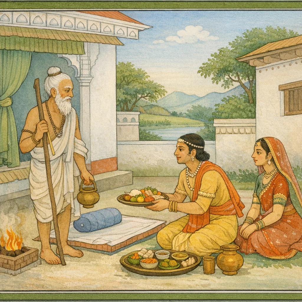 Bharadvāja said: “As for those who have entered the forest-dweller stage (vānaprastha), the accumulation of wealth and possessions is, for the most part, not their way. These virtuous men, desiring only pure and wholesome food, wander over the whole earth for the sake of Vedic study (svādhyāya), pilgrimage to sacred places, and the seeing of various lands. When such forest-dwellers arrive at one’s home, one should rise to greet them, go forward to receive them, and offer respectful salutations. One should speak to them without fault-finding, offer them pleasant words, provide—according to one’s ability—a comfortable seat, a comfortable bed, and suitable food, and thus render them full hospitality. This is the householder’s duty toward such excellent persons.”
