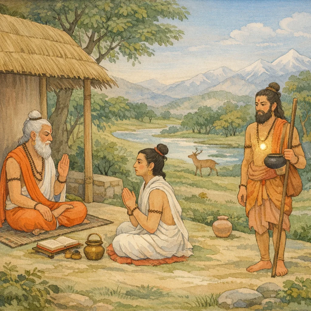 Bhṛgu said: Even those who have entered the forest-dweller’s stage (vānaprastha) follow dharma. They move about performing austerities at holy fords, along rivers and springs, and in secluded forests filled with deer, buffalo, boar, tigers, and wild elephants. Renouncing village life—fine clothing, rich foods, and sensual enjoyments—they subsist on what the wilderness provides: herbs, fruits, roots, and leaves, taken in measured, varied, and regulated portions. They sit on the ground and sleep on earth, stone, sand, gravel, dust, or ashes. Their bodies are covered with garments of reeds and kuśa-grass, animal skins, and bark-cloth. They keep their hair, beard, nails, and body-hair uncut, bathe at fixed times, and do not transgress the appointed seasons. They maintain offerings and fire-rites, gathering fuel-sticks, kuśa, and flowers for worship, and only after cleaning their hermitage do they allow themselves a little rest. Enduring cold, heat, rain, and wind until their skin cracks, and persisting in vows and disciplined practices, their flesh and blood dry up so that they seem little more than bones covered with skin—yet, with steadfast courage, they continue to bear the body’s burden. The passage presents vānaprastha as an ethical training in restraint, endurance, and ritual responsibility, where suffering is not sought for its own sake but accepted as the cost of inner steadiness and fidelity to dharma.
