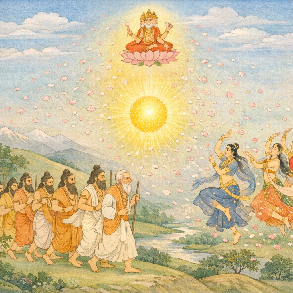 Then the Prāpitāmaha (Brahmā), stepping forward, said, “Welcome!” O lord of the people. That radiant being—having assumed the form of a man of about a span’s measure—approached Brahmā, while all around there arose a great tumult in every direction and the assembled beings began to praise that light. The scene underscores reverence for divine radiance and the proper ethic of honoring a worthy arrival through respectful reception.