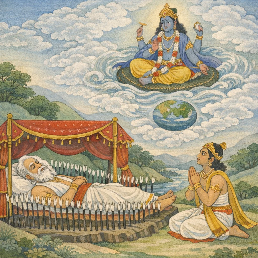 Yudhiṣṭhira said: “O best of the Bharatas! O grandsire of great wisdom! The lotus-eyed Lord Śrī Kṛṣṇa never falls away from his own majesty. He is the doer of all, the uncreated (akṛta, eternally accomplished), all-pervading, and the seat of the origin and dissolution of all beings. None can conquer him. He is also famed by the names Nārāyaṇa, Hṛṣīkeśa, Govinda, and Keśava. I wish to hear a true, principled inquiry into his essential nature.” Bhīṣma said: “Yudhishthira, I have heard this doctrine explained from the lips of Rama Jāmadagnya (Paraśurāma), the divine seer Nārada, and Kṛṣṇa Dvaipāyana Vyāsa.”