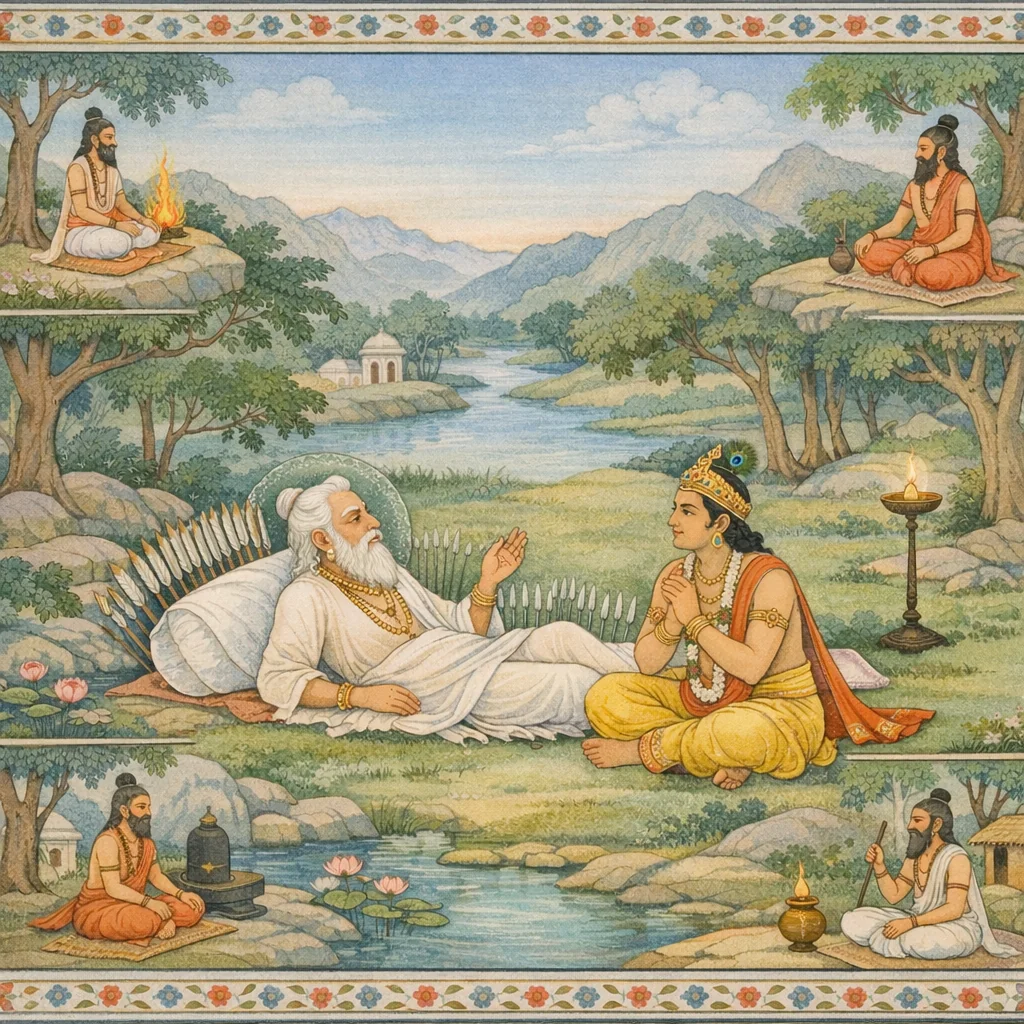 Chapter Arc: युधिष्ठिर के प्रश्न पर भीष्म वचन उठाते हैं—जगत् में दिशाओं के अधिपति कौन हैं, कौन-से ऋषि किस दिशा में प्रतिष्ठित हैं, और सृष्टि-परम्परा का यह विराट मानचित्र कैसे समझा जाए। → भीष्म सृष्टि के आदिस्रोत की ओर ले जाते हैं: स्वयम्भू सनातन ब्रह्मा, उनके महात्मा पुत्र, प्रजापतियों की वंश-परम्परा, फिर देव-समूहों और दिशाओं में स्थित ब्रह्मर्षियों की क्रमबद्ध सूची—नाम, कुल, और स्थान का विस्तृत विधान। → दिशा-दिशा में प्रतिष्ठित ब्रह्मर्षियों का निर्णायक ‘स्थापन’—दक्षिण और पश्चिम आदि दिशाओं के ऋषि-समूहों का उद्घोष, तथा अश्विनीकुमारों जैसे देव-वंश (मार्तण्ड-सूर्य के पुत्र) का स्पष्ट वंश-निर्धारण; मानो ब्रह्माण्ड का नक्शा एक श्लोक-श्रृंखला में स्थिर हो जाता है। → अध्याय देवताओं/दिशाओं/वर्ण-व्यवस्था के वर्णन को समेटते हुए फलश्रुति की ओर झुकता है—जो प्रातः उठकर इन देव-समूहों का कीर्तन/स्मरण करता है, वह स्वकृत-परकृत पापों से प्रमुक्त होता है। → यह ब्रह्माण्ड-गणना आगे भी चलती है—अगले प्रसंग में अन्य दिशाओं/समूहों का विस्तार और मोक्षधर्म की व्यापक कड़ी जुड़ने का संकेत।
