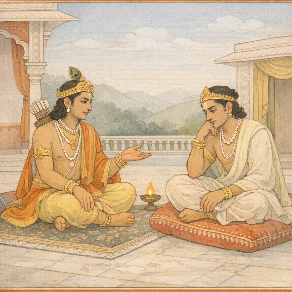 Chapter Arc: युद्ध की धूल बैठ चुकी है, पर युधिष्ठिर के भीतर का रण अभी थमा नहीं—राज्य मिलकर भी वे शोक और ग्लानि में तप रहे हैं; इसी बीच अर्जुन क्षत्रियधर्म की प्रशंसा करते हुए उन्हें फिर समझाने उठता है। → अर्जुन युधिष्ठिर को स्मरण कराता है कि क्षत्रिय के लिए राज्य दुर्लभ है और उसे क्षत्रधर्म से प्राप्त कर शोक में गलना शोभा नहीं; संग्राम में निधन क्षत्रियों के लिए मान्य मार्ग है—यही स्मृति युधिष्ठिर के वैराग्य को चुनौती देती है। → अर्जुन का निर्णायक प्रतिपादन: क्षत्रिय के लिए त्याग-यज्ञ-तप या पराश्रित जीविका नहीं, बल्कि प्रजा-रक्षा और राज्य-धारण ही प्रधान कर्म है; जो घटा वह ‘दिष्ट’ था—भाग्य/नियति को अतिक्रमित नहीं किया जा सकता। → अर्जुन युधिष्ठिर की धर्मज्ञता, राजनैपुण्य और लोक-ज्ञान को आधार बनाकर उन्हें राजधर्म में स्थिर होने का आग्रह करता है; क्षत्रधर्म को ब्रह्मसम्भव और लोक-प्रशस्त बताकर शासन को धर्म-पालन का साधन ठहराता है। → युधिष्ठिर अर्जुन की कठोर-करुण सलाह को कैसे ग्रहण करेंगे—क्या वे शोक से उठकर राजधर्म स्वीकार करेंगे या वैराग्य का आग्रह बनाए रखेंगे?