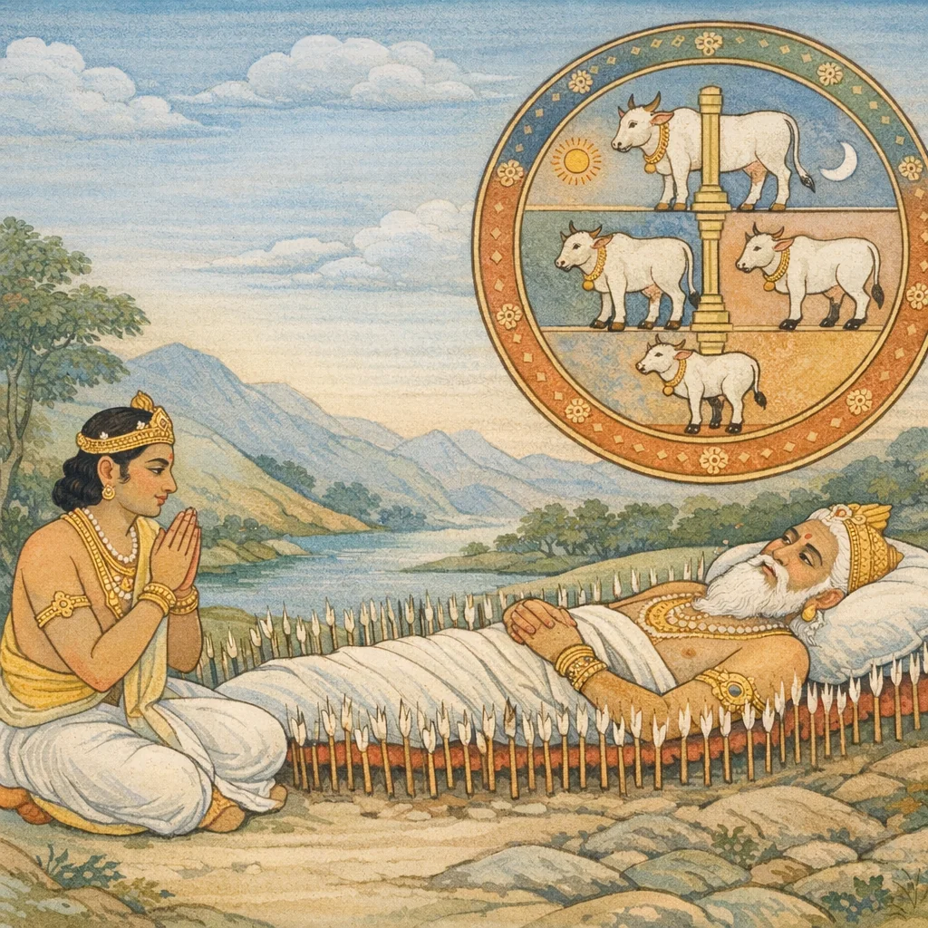 Chapter Arc: युधिष्ठिर, शान्ति-पर्व के मोक्षधर्म-प्रसंग में, लोक-तत्त्व और प्राणियों की गति-अगति का रहस्य जानने की तीव्र जिज्ञासा से प्रश्न उठाते हैं—यह सृष्टि-नाश और आवागमन किससे प्रवर्तित होता है? → भीष्म उत्तर देने के लिए एक पुरातन इतिहास का द्वार खोलते हैं: शुकदेव का व्यास से प्रश्न—काल, सृष्टि-प्रलय, और ब्राह्मण-धर्म के कर्तव्य का निश्चय। जिज्ञासा ‘किसने बनाया’ से आगे बढ़कर ‘काल कैसे चलाता है’ और ‘युग-धर्म कैसे घटता-बढ़ता है’ तक पहुँचती है। → युग-चक्र और ब्रह्मा के दिन-रात्रि का विराट मापन सामने आता है—कृत, त्रेता, द्वापर, कलि में धर्म का क्रमशः क्षय; और सहस्र-चतुर्युगों से ब्रह्मा का एक दिन, उतनी ही रात्रि—प्रलय में ईश्वर का ध्यान-निद्रा और फिर सृष्टि का पुनरुदय। काल का स्वरूप यहाँ ‘घड़ी’ नहीं, ‘सृष्टि की श्वास’ बनकर प्रकट होता है। → भीष्म, शुक-व्यास संवाद के माध्यम से यह स्थिर करते हैं कि लोक-तत्त्व, भूतों की गति, और युग-धर्म का परिवर्तन काल-नियम से बँधा है; जो ब्रह्मा के दिन-रात्रि को यथार्थ जानता है, वही काल-ज्ञान में स्थित होकर संसार-परिवर्तन को सम्यक् समझता है। → काल-चक्र का यह मापन आगे ‘जीव की मुक्ति-यात्रा’ और ‘कर्तव्य बनाम वैराग्य’ के सूक्ष्म निर्णयों की भूमि तैयार करता है—अब प्रश्न यह रह जाता है कि इस ज्ञान के प्रकाश में मनुष्य अपना आचरण कैसे स्थिर करे।