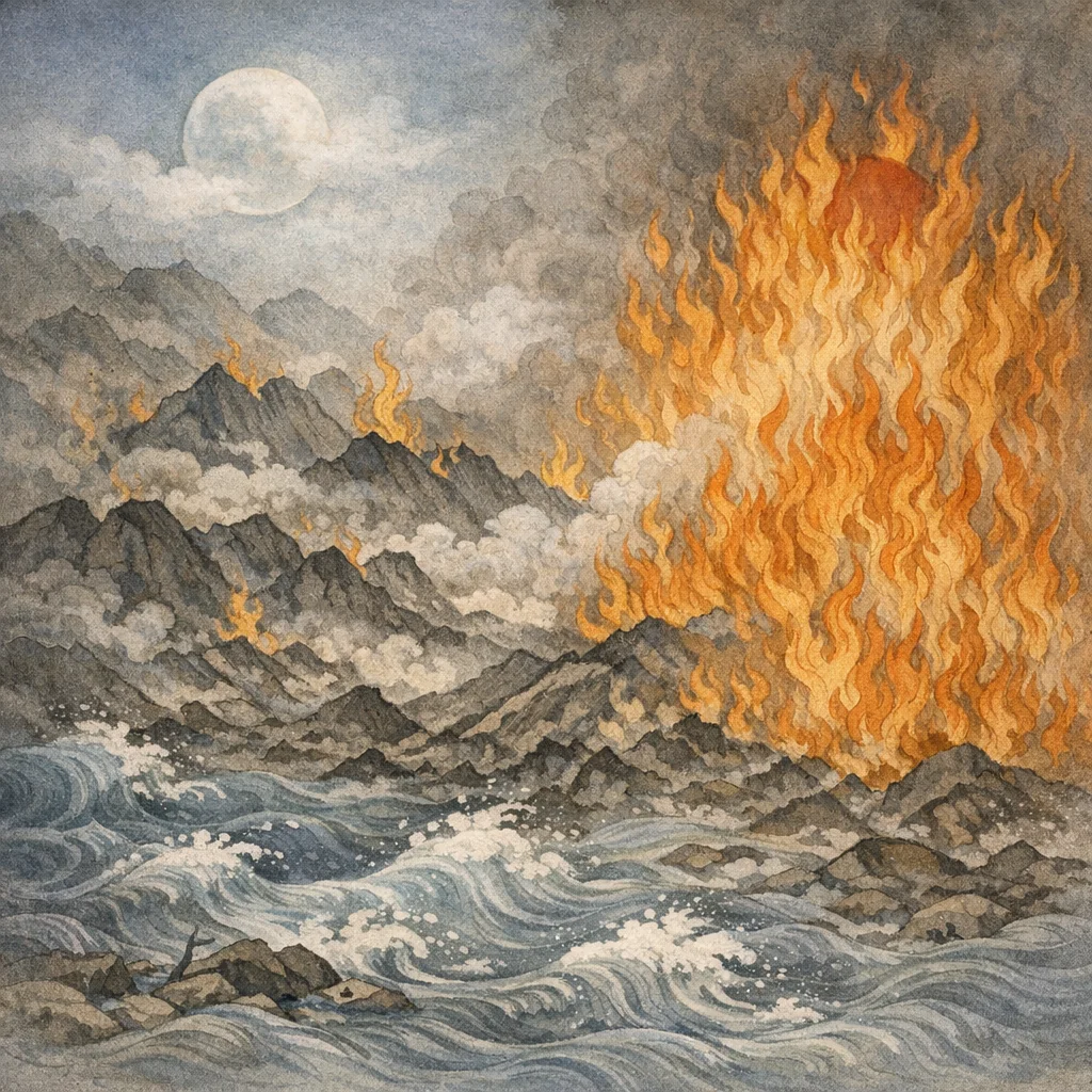 Vyāsa said: “When the time of dissolution arrives, the sun blazes in the sky, and seven fiery tongues of flame rise from below; they begin to consume the world. Then the entire universe appears filled and engulfed by flames, shining with a terrible, all-pervading conflagration.”