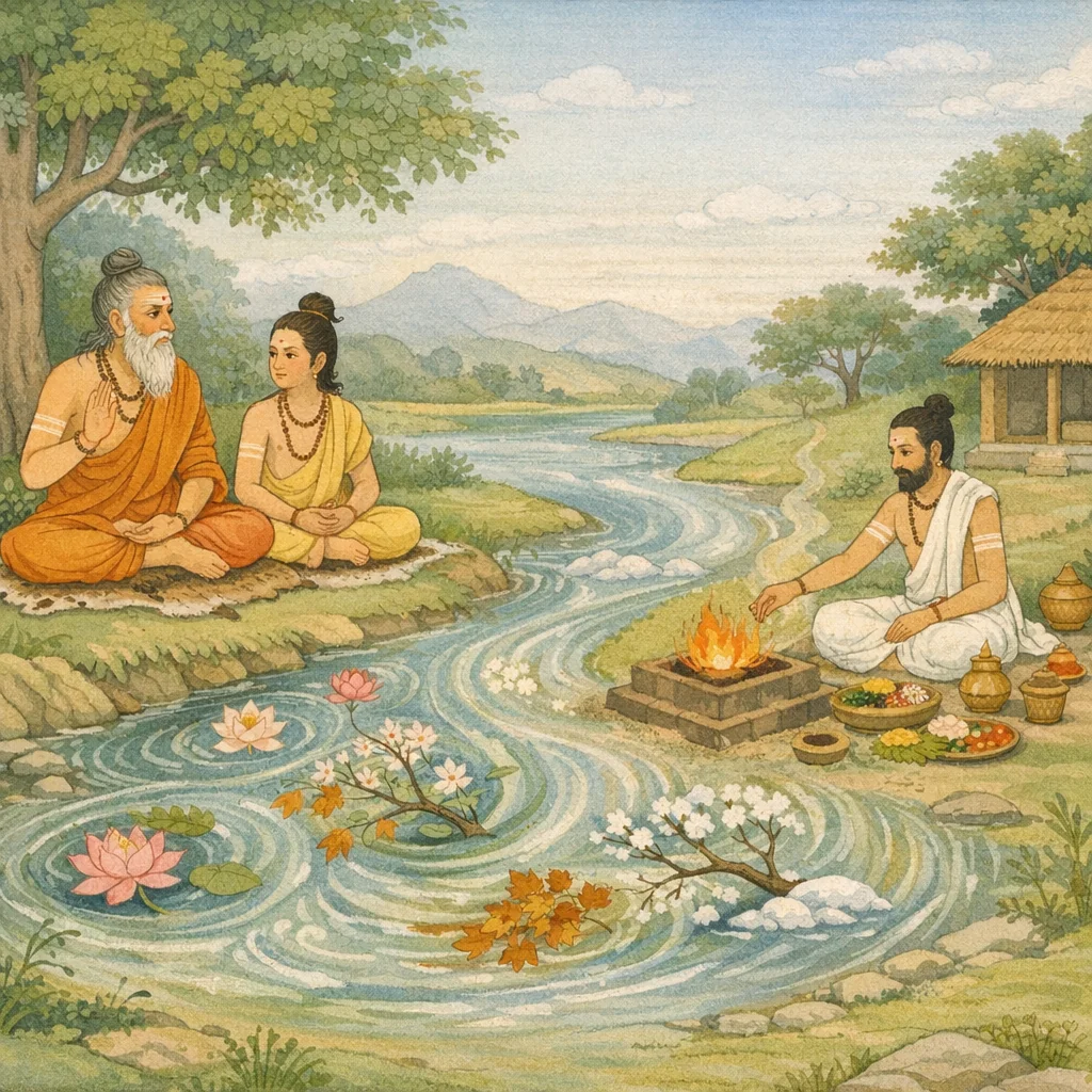 Vyāsa said: “Time is a vast river. Its water is Time itself; its whirlpools are the rains that rise without cease. Months are its surging waves; the seasons are its driving currents; fortnights are its creepers and grasses. Blinking and unblinking are its foam; days and nights are its flowing stream. Desire (Kāma) is a dreadful crocodile within it. The Vedas and sacrifices are boats; Dharma is an island that gives shelter to living beings. Wealth and pleasure are its waters; truth-speaking and liberation are its two banks. Trees of violence drift along in that current. The yugas mark its limits, and Brahman is the mountain-source from which this river of Time is born. Fallen into this stream, all creatures fashioned by the Creator are drawn onward toward Yama’s realm.”
