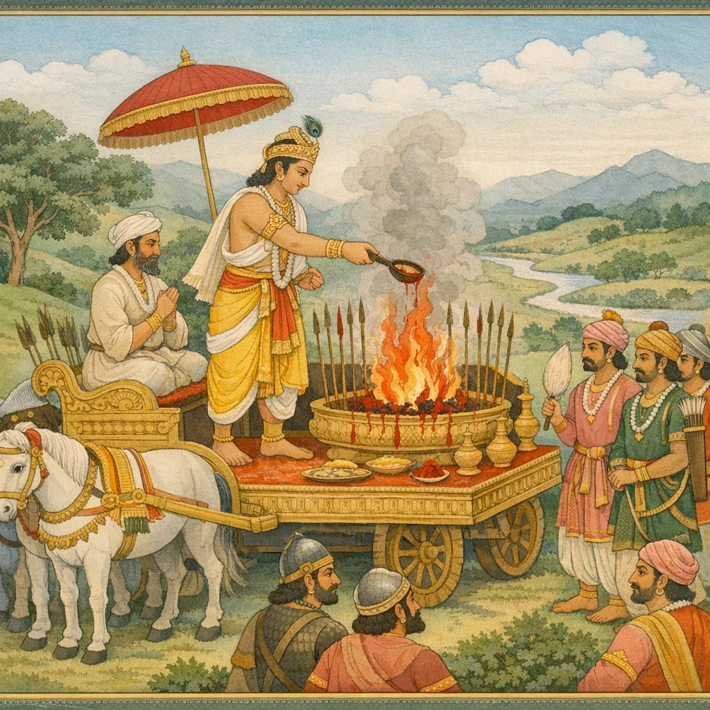 Vaiśampāyana said: “His bow served as the sacrificial post; the belt-strap became the bowstring; the arrows were like the ladle, and the sword performed the work of the offering-spoon. There, blood itself took the place of ghee. His chariot, moving wherever he willed, was the altar; the battle was the fire; and his four foremost horses were as the four chief priests of the cāturhotra rite. Thus that swift, lion-like king Hayagrīva, offering his enemies into the fire of this ‘sacrifice’ and finally offering up his own life-breath, became freed from sin; and having completed the war as though it were the concluding avabhṛtha bath, he now rejoices in the world of the gods.”