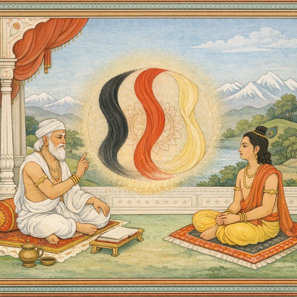 Chapter Arc: शुकदेव जिज्ञासा रखते हैं: शास्त्र एक ओर ‘कुरु कर्म’ कहता है और दूसरी ओर ‘त्यज कर्म’—ये परस्पर-विरोधी वचन साधक को किस मार्ग पर ले जाएँ? → भीष्म धर्म-विवाद की पीड़ा को छूते हैं—‘धर्म है’ और ‘धर्म नहीं’ जैसे प्रतिपक्षों की तरह ही कर्म-त्याग का द्वंद्व भी मन को व्यथित करता है। फिर वे बंधन का सूत्र रखते हैं: सकाम कर्म जीव को बाँधता है, ज्ञान मुक्त करता है; इसलिए पारदर्शी यति कर्म-आसक्ति से हटते हैं। → निर्णायक प्रतिपादन: कर्म को ‘अंत’ नहीं, ‘बंधन’ या ‘शुद्धि’ के संदर्भ में समझो—अधूरे ज्ञान वाले कर्म की प्रशंसा कर देह-जाल में रमते हैं, पर ज्ञान का लक्ष्य उस अवस्था की ओर है ‘जहाँ जाकर न मृत्यु है, न जन्म, न पुनरावृत्ति’। इसी के साथ त्रिगुण (तम-रज-सत्त्व), जीव-गुण और आत्मा-परमात्मा के भेद/सम्बन्ध का संकेत देकर मोक्ष-मार्ग का दार्शनिक आधार रखा जाता है। → भीष्म कर्म और ज्ञान के अन्तर को समन्वित करते हैं: सकाम कर्म बंधनकारी है, विवेक-ज्ञान विमोचक है; त्रिगुण-आधारित जीव-प्रकृति को जानकर साधक क्षेत्र-क्षेत्रज्ञ (देह-जड़ बनाम चेतन) का विवेक करता है और ब्रह्म-प्राप्ति के उपाय की दिशा पकड़ता है। → त्रिगुण, जीव-गुण और परमात्मा के सम्बन्ध का जो सूत्र यहाँ रखा गया है, उसका विस्तृत विवेचन आगे के अध्यायों में साधना-क्रम और ज्ञान-निष्ठा के रूप में खुलने को छोड़ दिया जाता है।