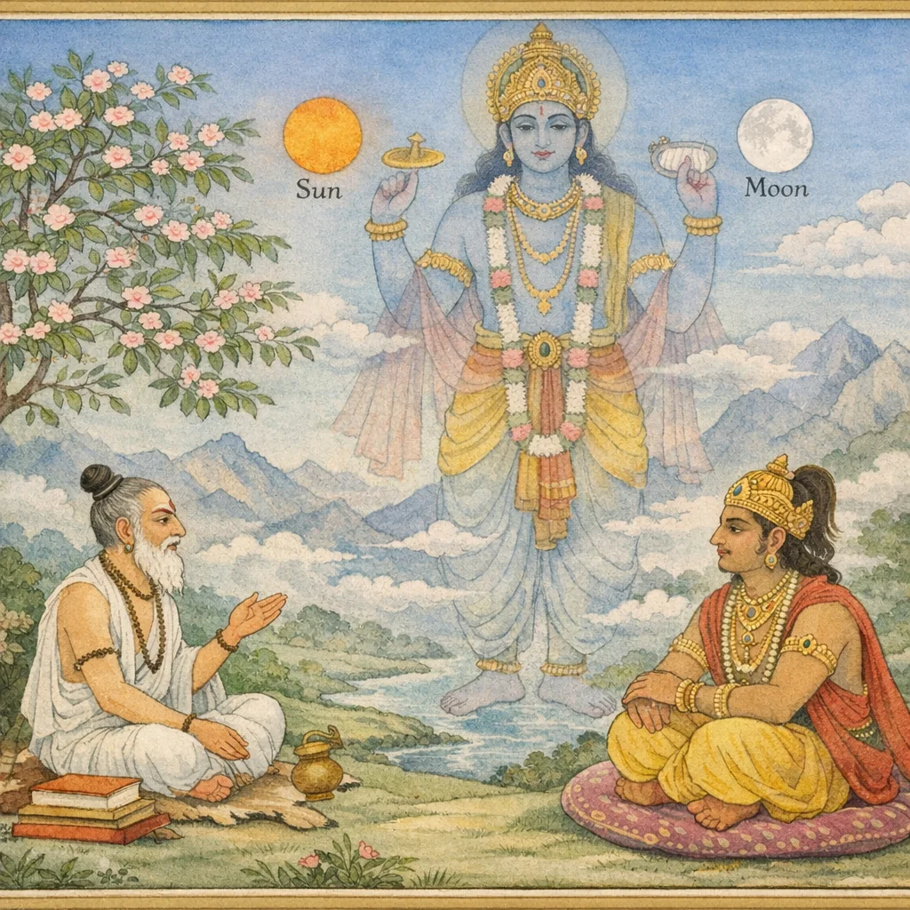 Bhishma said: “Of Him, the radiant Sun is the manifestation of splendor; the mind abides in the Moon; the intellect is ever established as the constant movement of knowing; and taste—the essence—is grounded in the waters.”