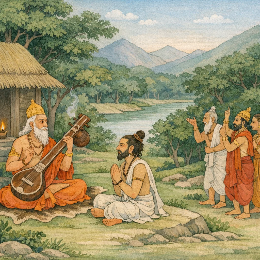 Narada said: “For this reason, virtuous men who seek true welfare investigate many kinds of wisdom—excellent discernment—through the study of numerous śāstras. To me, the gain of such wisdom seems the highest good for all living beings. Therefore, even a learned and intelligent person should not offer instruction unasked, nor respond when questioned in an improper or unjust manner. In such situations, the wise should remain seated in silence, as though inert—guarding speech so that knowledge is not misused and dharma is not compromised.”