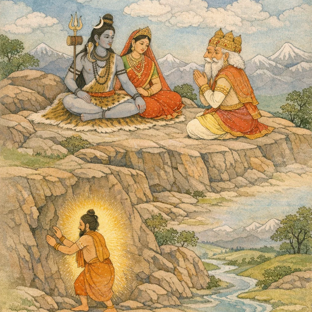 Bhīṣma said: Then the Lord of the gods, Śiva, recognizing him in that very form as one perfected by austerity, and perceiving him to be stationed upon the trident, gently inclined the trident with his own hand. The episode underscores how divine power responds to true tapas—acknowledging spiritual attainment and restraining force with measured, purposeful action rather than needless harm.
