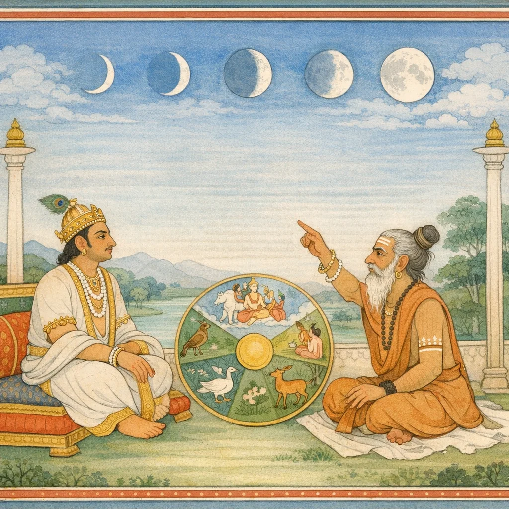 Vasiṣṭha said: “The fifteenfold kalā is the womb—the source in which beings arise—and the ignorant awaken only to that abode, taking it as their support. But know this always, O king: there is also a sixteenth kalā, the Soma principle—subtle and enduring—like the moon’s sixteenth phase (amā), beyond the changing fifteen.”