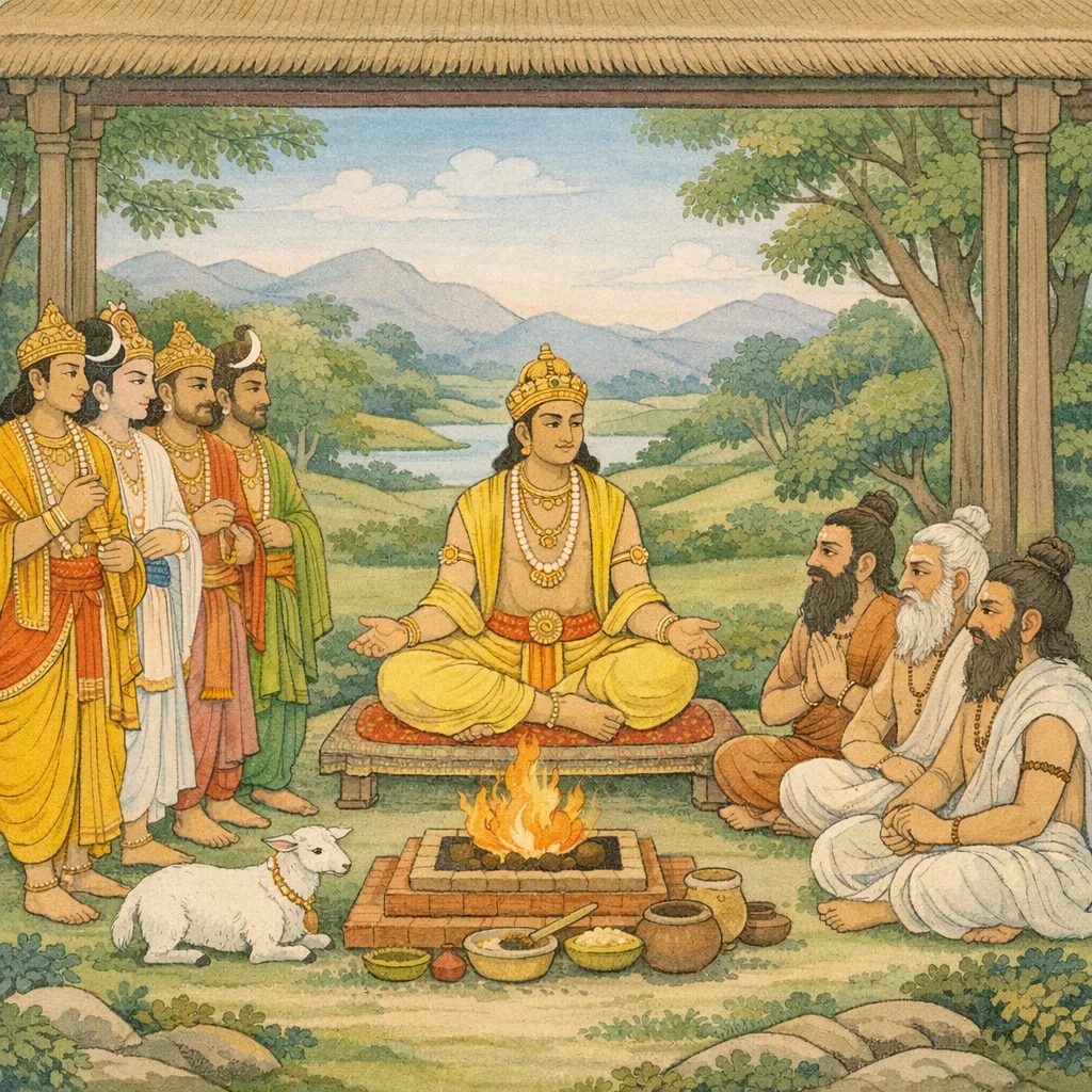 Chapter Arc: भीष्म युधिष्ठिर से कहते हैं कि ‘अज’ शब्द के अर्थ को लेकर देवताओं और ऋषियों के बीच एक प्राचीन विवाद हुआ था—और उसी एक शब्द ने यज्ञ-धर्म की दिशा बदल दी। → देवता ‘अजेन यष्टव्यम्’ का अर्थ ‘छाग (बकरा) से यज्ञ’ बताने लगते हैं, जबकि ब्राह्मण-ऋषि ‘अज’ को ‘अन्न/धान्य’ (अज = अजा नहीं, अन्न) मानते हैं। राजा वसु/उपरिचर वसु से निर्णय कराने की स्थिति बनती है; पक्षपात का भय बढ़ता है क्योंकि राजसत्ता का एक वचन शास्त्रार्थ को लोकाचार बना देता है। → देवताओं का मत जानकर वसु पक्ष-आश्रय से घोषणा कर देता है—‘अज’ का अर्थ ‘छाग’ है और यज्ञ पशु-बलि से ही होगा; यही वह क्षण है जहाँ शब्दार्थ का निर्णय धर्म-व्यवहार में हिंसा/अहिंसा की धुरी बन जाता है। → वसु बाद में विष्वक्सेन (नारायण) की पूजा आरम्भ करता है और नारायण-मुखोद्गत जप का आश्रय लेता है; परन्तु शास्त्रार्थ में पक्षपात के कारण उसे अधोगति/पतन का प्रसंग जुड़ता है—यह संकेत कि भक्ति भी तब तक रक्षक नहीं जब तक निर्णय में सत्य और निष्पक्षता न हो। → भीष्म संकेत देते हैं कि इस विवाद का फल केवल वसु तक सीमित नहीं—यज्ञ-धर्म की व्याख्या और राजधर्म की सत्यनिष्ठा पर आगे और भी गहरी शिक्षा निकलेगी।