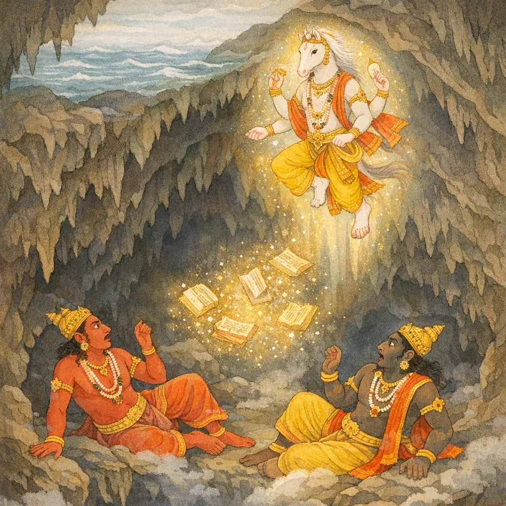 Chapter Arc: शौनक ऋषि जिज्ञासा करते हैं—जिस नारायण की महिमा वेदों में गायी जाती है, वही कैसे वेदों के लोप के समय उन्हें पुनः प्रकट करते हैं? कथा का द्वार हयग्रीव-अवतार के रहस्य से खुलता है। → सृष्टि-प्रक्रिया (प्रवृत्ति-निवृत्ति), प्राचीन पिण्डोत्पत्ति और यज्ञ-व्यवस्था का संकेत देकर कथा उस संकट की ओर बढ़ती है जहाँ मधु-कैटभ वेदों को कालपाश से बाँधकर रसातल में फेंक देते हैं; वेद-ध्वनि का लोप और धर्म-ज्ञान का अंधकार फैलता है। → समुद्र के उत्तर-पूर्व भाग में हव्य-कव्य-भोजी विष्णु महाहयग्रीव रूप धारण करते हैं; रसातल में उतरकर वेदों को पुनः प्राप्त करते हैं और मधु-कैटभ का संहार कर वेद-धर्म की रक्षा करते हैं। → भगवान् वेदों को ब्रह्मा को लौटा देते हैं; उपदेश-रूप में प्रतिपादित होता है कि वेदों का पर्यवसान नारायण में है, यज्ञ नारायण-स्वरूप हैं, सत्य-ऋत-धर्म सब नारायण-पर हैं—अर्थात् ज्ञान, कर्म और तप का अंतिम आश्रय एक ही है।