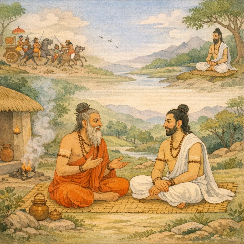 Chapter Arc: एक ब्राह्मण अपने ही नाम-रूप और वाणी-माधुर्य से परिचित कराता है, पर भीतर से संसार-सागर के पार जाने की तीव्र आकांक्षा लिए पूछता है—धर्मरूपी ‘प्लव’ कहाँ है, किस मार्ग से पार उतरा जाए? → वह गृहस्थ-धर्म को पुत्रों के अधीन कर, भोग-काल में भी मन के न रजने की बात कहता है; यतियों की परलोक-प्रार्थना सुनकर उसका वैराग्य और तीखा होता है—पर मार्ग अनेक हैं, निर्णय कठिन। → अतिथि स्वयं स्वीकार करता है कि वह भी उसी दुविधा में है—त्रिविष्टप के ‘बहुद्वार’ हैं: कोई युद्ध में अभिमुख होकर मरकर स्वर्ग जाता है, कोई उग्र व्रत-साधना से; इतने खुले धर्म-द्वारों के बीच बुद्धि ‘वायु से हिली मेघ-रेखा’ की तरह चंचल हो उठती है। → संवाद का निष्कर्ष यह बनता है कि स्वर्ग/उन्नति के मार्ग एक नहीं—धर्म के अनेक द्वार हैं; इसलिए साधक को अपने स्वभाव, सामर्थ्य और निष्ठा के अनुसार धर्म-मार्ग चुनना होगा, केवल एक ही ‘एकमात्र’ उपाय का आग्रह भ्रम बढ़ाता है। → धर्म के बहुद्वार स्वीकार हो गए, पर ‘निश्चय’ अभी भी शेष है—अगले प्रसंग में यह प्रश्न उभरता है कि अनेक मार्गों में से साधक किस कसौटी से अपना मार्ग निश्चित करे।
