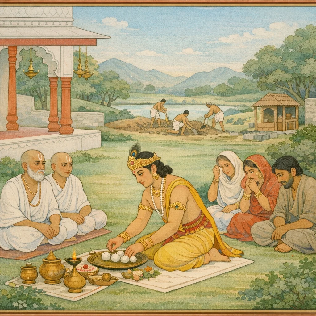 Chapter Arc: युद्ध की धूल बैठ चुकी है, पर शोक का धुआँ अभी उठ रहा है—वैशम्पायन बताते हैं कि राजा युधिष्ठिर और धृतराष्ट्र अपने-अपने प्रियजनों तथा अन्य राजाओं के और्ध्वदेहिक कर्म (श्राद्ध) का विधान करते हैं। → कुरुक्षेत्र में मरे असंख्य राजाओं और वीरों के लिए कर्तव्य-भार बढ़ता जाता है: धृतराष्ट्र अपने पुत्रों का श्राद्ध करते हैं, युधिष्ठिर द्रोण, कर्ण और अन्य महात्माओं का; धृष्टद्युम्न, अभिमन्यु, घटोत्कच, विराट आदि मित्र-उपकारियों का भी। जिनका कोई सुहृद नहीं, उनके लिए भी कर्म कराए जाते हैं—राजधर्म का करुण विस्तार। → युधिष्ठिर का निर्णायक संकल्प—‘स तेषामनृणो भूत्वा’—सबके प्रति ऋण-मुक्त होने हेतु, मित्र-शत्रु, अपने-पराये, अनाथ-परित्यक्त सभी के लिए और्ध्वदेहिक कर्म और दान-व्यवस्था; साथ ही धर्मशालाएँ, प्याऊ, पोखरे जैसे लोक-हितकारी निर्माण। → श्राद्ध, अन्न-दान, गौ-धन-दान और सेवाभाव से शोक का रूपांतरण होता है: युधिष्ठिर धृतराष्ट्र, गान्धारी, विदुर तथा मान्य कौरवों की पूर्ववत सेवा करते हैं; भृत्यों का सम्मान करते हैं; दीन-दुखियों और अंधों के लिए घर, भोजन, वस्त्र की व्यवस्था कर ‘आनृशंस्य’ (करुणा) को राज्य-नीति बनाते हैं।