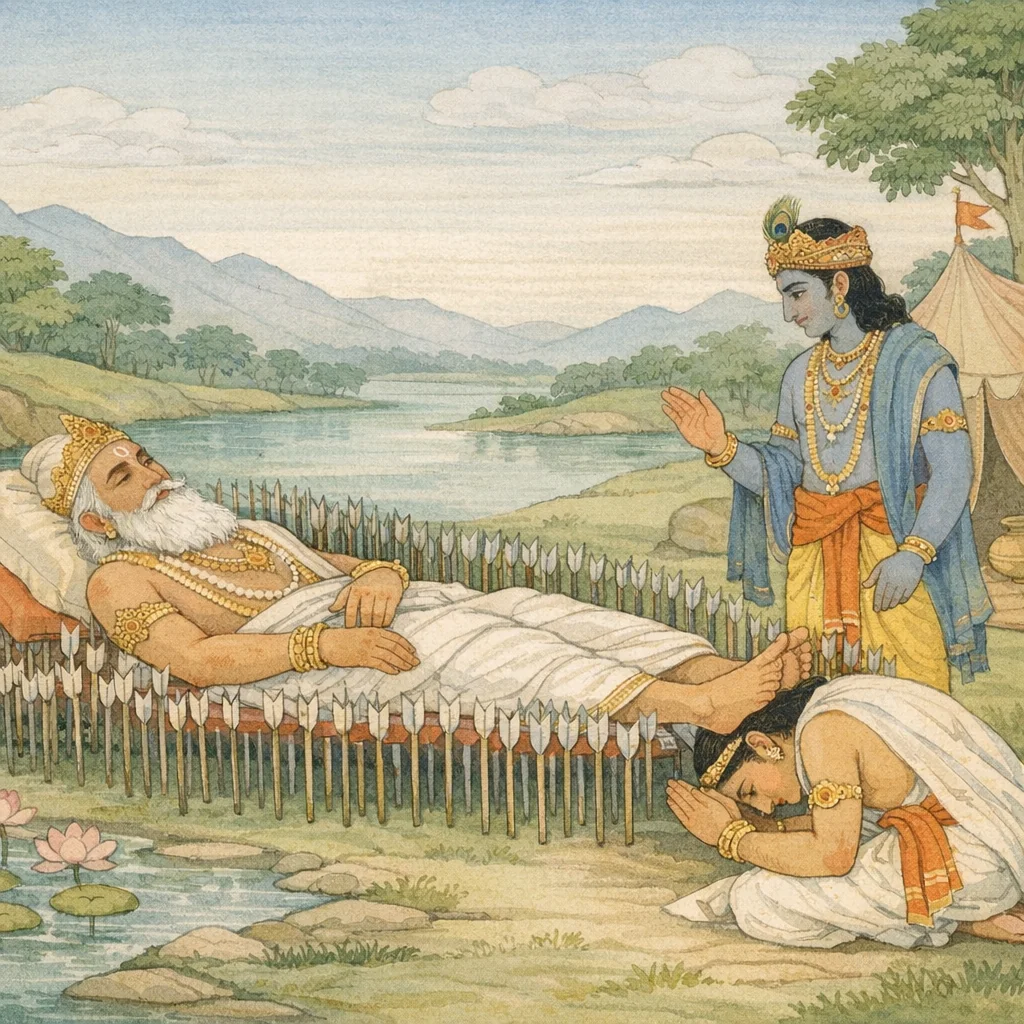 Chapter Arc: शरशय्या पर पड़े भीष्म धर्म-उपदेश के लिए तत्पर हैं, पर धर्मराज युधिष्ठिर लज्जा और शाप-भय से समीप आने का साहस नहीं कर पा रहे—यह मौन ही अध्याय का पहला प्रश्न बन जाता है। → श्रीकृष्ण युधिष्ठिर की संकोचग्रस्त अवस्था को भीष्म के सामने रखते हैं और संकेत देते हैं कि धर्म-ज्ञान का द्वार तभी खुलेगा जब युधिष्ठिर स्वयं प्रश्न करेंगे; भीष्म भी युधिष्ठिर की धर्मनिष्ठा और राजर्षित्व का स्मरण कर उन्हें बुलाने का आग्रह करते हैं। → युधिष्ठिर आगे बढ़कर भीष्म के चरण पकड़ते हैं; भीष्म उन्हें मस्तक पर स्पर्श/आशीर्वाद देकर बैठने को कहते हैं और स्पष्ट आदेश देते हैं—‘निर्भय होकर, एक-एक करके धर्म पूछो; मैं अखिल धर्म कहूँगा।’ → भीष्म की स्वीकृति और श्रीकृष्ण की मध्यस्थता से युधिष्ठिर का भय ढलता है; संवाद की विधि तय होती है—प्रश्न-उत्तर के क्रम में धर्म का विस्तृत निरूपण आरम्भ होने को तैयार है। → भीष्म का अंतिम संकेत—‘मैं स्वस्थ हूँ, अब पूछो’—अगले अध्याय में युधिष्ठिर के प्रथम प्रश्न और शान्तिपर्व के दीर्घ धर्मोपदेश का द्वार खोल देता है।