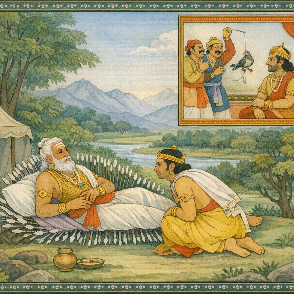 Chapter Arc: शरशय्या पर पड़े भीष्म के पास युधिष्ठिर का प्रश्न उठता है—‘राजाओं का परम धर्म’ जिसे धर्मवेत्ता सर्वोच्च कहते हैं, वह इतना भारी क्यों है, और उसे कैसे साधा जाए? → युधिष्ठिर आग्रह करते हैं कि राजधर्म समस्त जीव-जगत का आश्रय है; अतः उसका ‘विशेष’ वर्णन हो। भीष्म नियमपूर्वक एकाग्र होकर सुनने को कहते हैं और राजधर्म के व्यावहारिक संकट खोलते हैं—राजा के लिए पुरुषार्थ, सत्य, संयम और व्यसनों का त्याग अनिवार्य है; किंतु कोमलता/परिहासशीलता और ढील से राज्य-तंत्र में दोष पनपते हैं। → भीष्म चेताते हैं कि जब राजा मृदु, हर्षशील और अनुशासन-शिथिल होता है, तब अधिकारी/सेवक अधिकार से बाहर जाकर काम को निंदित करते, संतोष नहीं करते, राज-देय हरते, और राजा को ‘डोर से बँधी चिड़िया’ की तरह खेल का विषय बना लेते हैं—यही राजधर्म का कठोर सत्य है: शासन में दया के साथ दंड-नीति का संतुलन टूटते ही व्यवस्था भ्रष्ट हो जाती है। → भीष्म राजधर्म का सार स्थिर करते हैं—राजा को सत्यनिष्ठ, पुरुषार्थी, सतर्क, व्यसन-रहित और अनुशासन-प्रधान होना चाहिए; शासन में ‘संग’ (दोषपूर्ण आसक्ति/अनुचित मेल) से बचना और राज्य-यंत्रणा के सूक्ष्म संकेतों को पहचानना आवश्यक है। → भीष्म की चेतावनी आगे के लिए द्वार खोलती है—राजा को किन-किन उपायों से अमात्य-वर्ग, कर-व्यवस्था और दंड-नीति को शुद्ध रखना चाहिए, इसका विस्तृत विधान अभी शेष है।