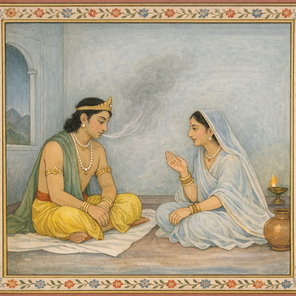 Then the wise king, his inner being overwhelmed by grief and tormented by anguish, sank into dispassion. Like a fire wreathed in smoke, he seemed to burn inwardly—his mind clouded by sorrow and turning away from the attractions of life and kingship.