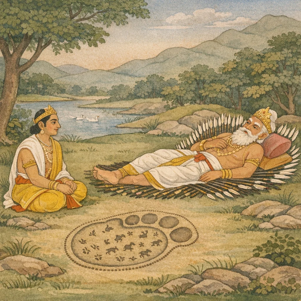 Chapter Arc: शरशय्या पर लेटे भीष्म युधिष्ठिर से कहते हैं कि धर्म केवल त्याग या तप का नाम नहीं—जीवन-यापन के साधन, सेवा, और वर्णाश्रम के कर्तव्य भी धर्म के ही अंग हैं। → भीष्म गृहस्थ ब्राह्मण के लिए ‘षट्कर्म’ (वेदाध्ययन-अध्यापन, यजन-याजन, दान-प्रतिग्रह) का विधान रखते हुए यह भी बताते हैं कि कुछ आजीविकाएँ—राजसेवा, कृषि-धन, वाणिज्य-पथ—सीमित रूप से स्वीकार्य हैं, पर कपट, व्यभिचारजन्य वृत्ति, और सूद (कुसीद) जैसे मार्ग वर्जित हैं; यहीं से ‘धर्मसम्मत जीविका’ बनाम ‘लोभजन्य उपाय’ का तनाव उभरता है। → भीष्म राजधर्म की सर्वग्राहिता का महावाक्य देते हैं—जैसे हाथी के पदचिह्न में अन्य सब प्राणियों के पदचिह्न समा जाते हैं, वैसे ही समस्त धर्म राजधर्म में समाहित हैं; त्याग, दीक्षा, विद्या, और लोक-व्यवस्था—सबका आश्रय राजा का धर्म है। → वर्णाश्रम-धर्म की मर्यादा स्पष्ट होती है: ब्राह्मण के लिए दम, शौच, आर्जव और आश्रम-व्यवस्था; वैश्य के लिए परिश्रमपूर्वक स्वधर्म निभाकर कृतकृत्य होने पर आश्रम-आश्रय की अनुमति; और राजा के लिए वेद-राजशास्त्र का धर्मपूर्वक अध्ययन, प्रजा-पालन हेतु अनुशासन—जिससे अन्य सभी धर्म सुरक्षित रहते हैं।