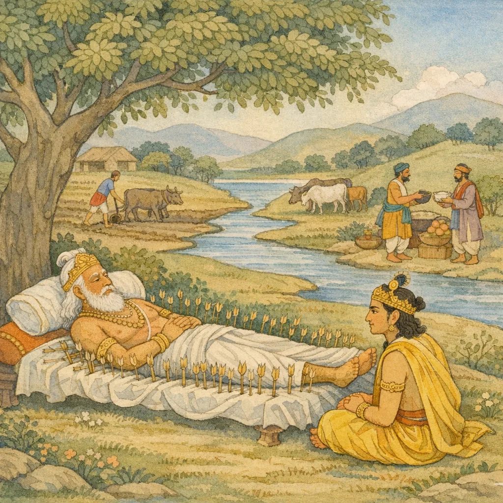 Chapter Arc: शरशय्या पर पड़े भीष्म युधिष्ठिर को आपत्तिकाल-धर्म का द्वार दिखाते हैं—जब ब्राह्मण की आजीविका नष्ट हो जाए, तब वह किन-किन वृत्तियों से जीवित रह सकता है। → भीष्म बताते हैं कि असमर्थ ब्राह्मण, यदि क्षात्र-वृत्ति भी न निभा सके, तो वैश्य-वृत्ति (कृषि, गोरक्षा, व्यापार) से निर्वाह करे; पर साथ ही व्यवहार की शुचिता—‘बलात् नहीं, रुचि और विनिमय से’—पर जोर देते हैं। युधिष्ठिर की चिंता बढ़ती है: जब प्रजा शस्त्र उठा ले और स्वधर्म से विचलित हो, तब राज्य-व्यवस्था कैसे टिकेगी? → धर्म-व्यवस्था के उलट जाने का तीखा संकेत आता है—जब लोहे का पत्थर काटना, अग्नि का जल के पास जाना, और क्षत्रिय-ब्राह्मण का परस्पर द्वेष जैसे ‘विपर्यय’ घटित हों, तब समाज के आधार-स्तम्भ नष्ट होने लगते हैं; इसी बिंदु पर आपत्तिकाल-धर्म की अनिवार्यता और उसकी सीमा दोनों स्पष्ट होती हैं। → भीष्म निष्कर्ष देते हैं कि प्राचीन सत्पुरुषों के व्यवहार का मूल ‘न्यायपूर्ण विनिमय’ और ‘रक्षा’ है—राजा वही योग्य है जो सज्जनों की रक्षा करे और दुष्टों को दण्ड देकर अधर्म रोके; तभी जगत सुरक्षित रहता है। → युधिष्ठिर के प्रश्न की छाया बनी रहती है—यदि सब अपने-अपने धर्म से हटें, तो राजा किस उपाय से पुनः मर्यादा स्थापित करे?
