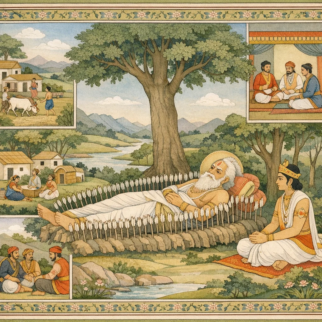 Chapter Arc: भीष्म युधिष्ठिर को वामदेव-गीता के राजधर्म का सूत्र पकड़ाते हैं—राज्य-लाभ की दौड़ से पहले ‘मूल’ (राज्य की जड़) को दृढ़ करो, अन्यथा प्राप्ति भी विनाश का कारण बनती है। → उपदेश क्रमशः कठोर यथार्थ पर टिकता है: दुर्बल-मूल राजा को लाभ नहीं ठहरता; समृद्ध जनपद, संतुष्ट सचिव, प्रिय-याजक/हितैषी, और तृप्त सैनिक—ये सब मिलकर राज्य की जड़ बनते हैं। राजा का दण्ड भी तभी प्रभावी है जब प्रजा-तंत्र भीतर से पुष्ट हो; अन्यथा दण्ड क्रूरता बन जाता है। → चरम बिंदु आत्म-शासन का तीखा विधान है—राजा को अपने ही आचरण को ‘वन के परशु’ की तरह तराशना चाहिए; जो अपने सदाचारी स्वजनों के प्रति मिथ्या व्यवहार करता है, वह स्वयं अपनी जड़ काटता है। साथ ही निर्णायक कसौटी रखी जाती है: जिसे श्रेष्ठ पुरुष निंद्य मानें, वह कर्म राजा न करे; जो सबके कल्याणकारी हो, उसी में स्वयं को लगाए। → भीष्म निष्कर्ष देते हैं कि जो राजा प्रजा के प्रति ऐसा धर्मयुक्त व्यवहार करता है, वह इहलोक-परलोक दोनों में विजय पाता है। वामदेव के उपदेश को मानकर पूर्व नृप ने सब वैसा ही किया—यह उदाहरण बनकर युधिष्ठिर के लिए मार्ग प्रशस्त करता है।