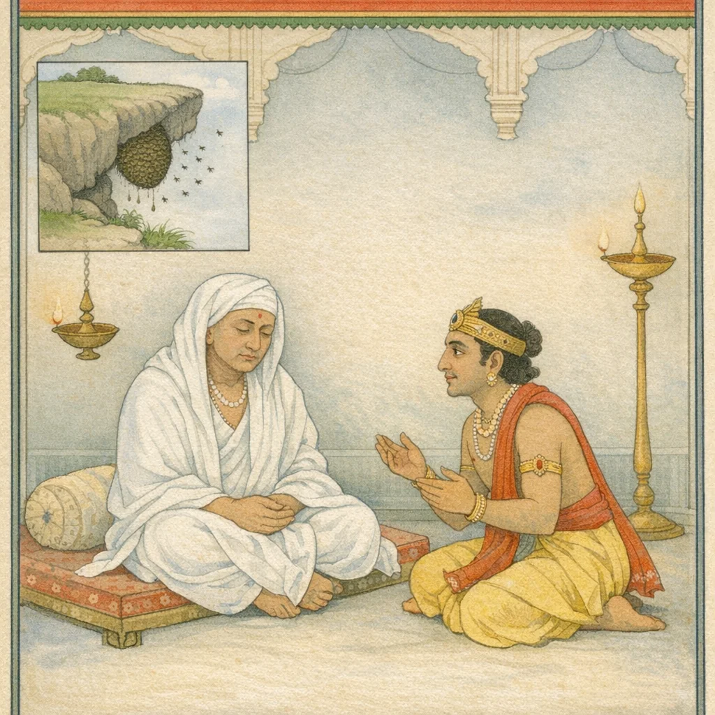 मधु य: केवल दृष्टवा प्रपातं नानुपश्यति । स भ्रष्टो मधुलो भेन शोचत्येवं यथा भवान्,“जो केवल ऊँचे स्थानपर लगे हुए मधुको देखकर वहाँसे गिरनेकी सम्भावनाकी ओरसे आँख बंद कर लेता है, वह उस मधुके लालचसे नीचे गिरकर इसी तरह शोक करता है, जैसे आप कर रहे हैं