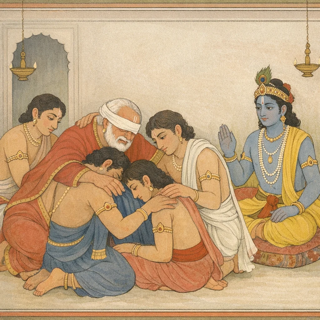 Chapter Arc: युद्धोत्तर शोक में डूबे धृतराष्ट्र के पास सेवक शौच-सम्बन्धी कार्यों के लिए आते हैं—राजा का मन अभी भी क्रोध, ग्लानि और पुत्र-शोक से काँप रहा है। → श्रीकृष्ण धृतराष्ट्र के भीतर उठते प्रतिशोध और आत्म-दोषारोपण को लक्ष्य कर कठोर वाणी में फटकारते हैं—राजा को स्थिरप्रज्ञ होकर अपने दोष देखने, देश-काल का विचार करने और क्रोध को त्यागने का उपदेश देते हैं; दुर्योधन द्वारा द्रौपदी-अपमान जैसे अपराधों की स्मृति भी उभरती है। → कृष्ण की सत्य-भरी कठोरता धृतराष्ट्र के भीतर जमे क्रोध को तोड़ देती है; राजा स्वीकार करता है कि अब उसका मन शांत है, ज्वर-सा रोष उतर गया है, और वह पाण्डवों—विशेषतः भीम—से मिलने को व्याकुल है। → धृतराष्ट्र पाण्डवों के निकट जाकर रोते हुए भीम और अर्जुन तथा माद्री-पुत्रों (नकुल-सहदेव) को हृदय से लगाता/स्पर्श करता है, उन्हें आश्वासन देता है और कल्याण-वचन कहता है—शत्रुता की जगह क्षणिक मेल और शोक-साझेदारी स्थापित होती है। → यह आलिंगन क्या स्थायी क्षमा में बदलेगा, या शोक के भीतर छिपी राजनीति और प्रतिशोध फिर सिर उठाएंगे?