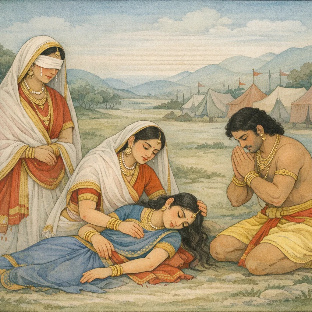 Vaiśampāyana said: She saw them, wounded and torn in many ways by weapons. With tears flowing, she cast her gaze upon their bodies again and again, as if to confirm what war’s violence had made unbearable. And she kept touching her sons one by one, repeatedly, in a mother’s grief and duty of recognition.