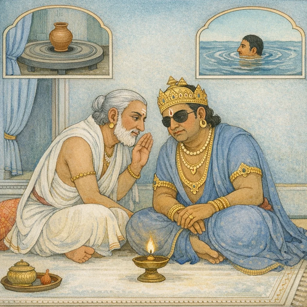 Chapter Arc: कुरु-गृह पर शोक का घना आवरण है; धृतराष्ट्र अपने पुत्रों के विनाश से व्याकुल हैं, और विदुर शोक-निवारण के लिए अनित्यता का कठोर, पर करुण उपदेश आरम्भ करते हैं। → विदुर मन को दुःख-सुख के आवेगों से बार-बार खींचकर शान्ति में स्थिर करने की शिक्षा देते हैं—और फिर श्मशान की समता दिखाते हैं: विद्वान-मूर्ख, धनवान-निर्धन, सब अंततः एक ही ‘पितृवन’ में पहुँचते हैं; देह का भेद वहाँ मिट्टी, अस्थि और स्नायु में विलीन हो जाता है। → मिट्टी के बर्तन का दृष्टान्त चरम पर पहुँचता है—घड़ा चाक पर चढ़ते ही टूट सकता है, आधा बनकर, पूरा बनकर, काटे जाने पर, उतारे जाने पर; वैसे ही जीवन किसी भी क्षण टूट सकता है। तत्पश्चात संसार-समुद्र का रूपक आता है: क्रीड़ा में तैरता प्राणी जैसे कभी डूबता-कभी उभरता है, वैसे ही जीव कर्म-भोग के बन्धन से इस गहन संसार में उन्मज्जन-निमज्जन करता है। → विदुर का निष्कर्ष स्पष्ट है—जो बुद्धिमान है वह मन को संयमित कर, अनित्यता को स्वीकार कर, शोक का त्याग कर शान्ति प्राप्त करे; धृतराष्ट्र को भी यही मार्ग अपनाने का आग्रह है। → धृतराष्ट्र के भीतर यह उपदेश कितनी गहराई तक उतरता है—और क्या शोक सचमुच शान्त होगा—यह अगले प्रसंग की ओर कथा को धकेल देता है।