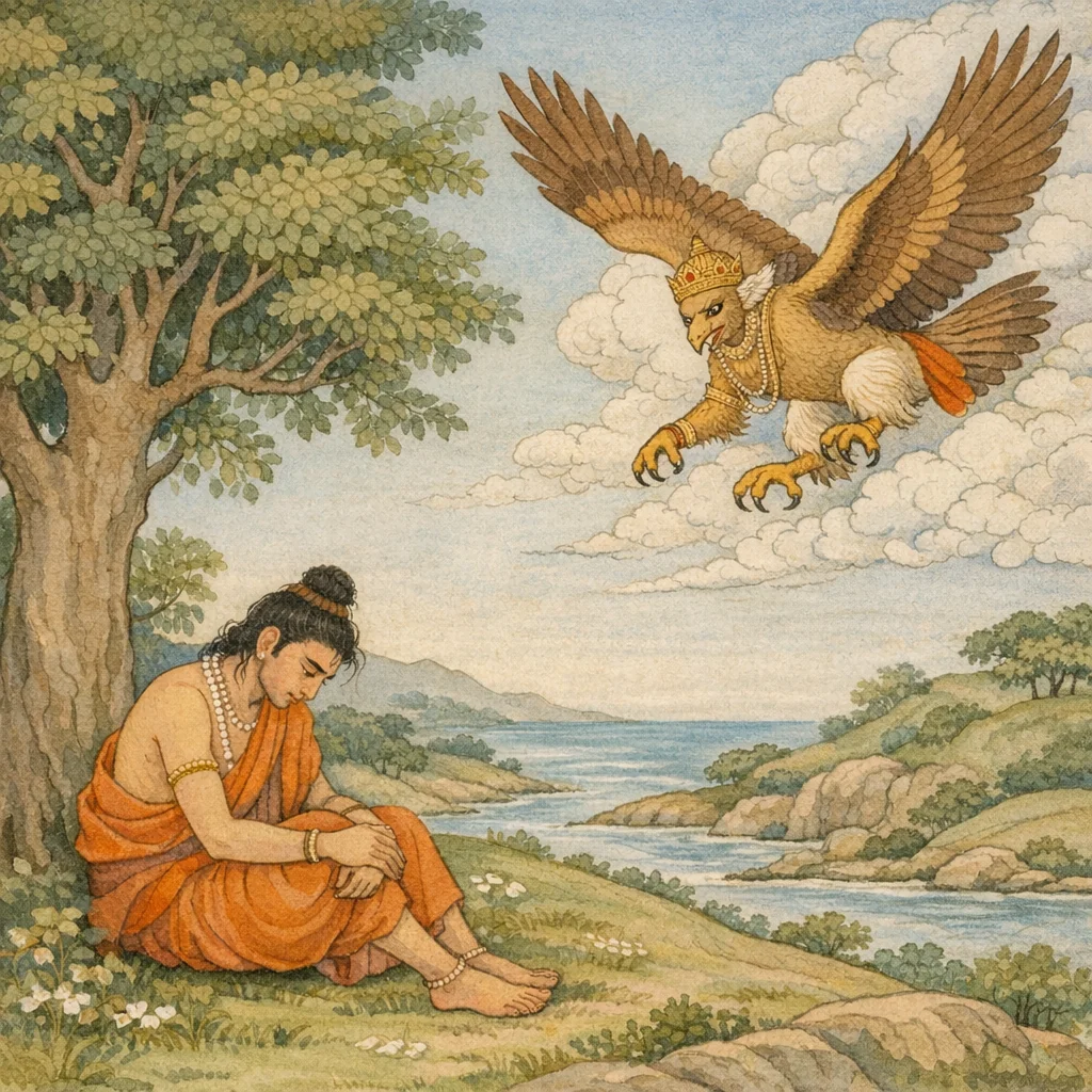 Chapter Arc: नारद गालव की दारुण दशा का चित्र खींचते हैं—प्रतिज्ञा के बोझ से दबा वह न बैठ पाता है, न सो पाता; चिंता-शोक में गलता हुआ मानो त्वचा और अस्थि मात्र रह गया है। → गालव अपने ही मन से प्रश्न करता है: ‘ऐसे मित्र कहाँ जो धन से पुष्ट हों? आठ सौ चन्द्र-शुभ्र घोड़े कहाँ से आएँ? भोजन में रुचि, सुख में श्रद्धा—सब कट गई; ऐसे जीवन का क्या अर्थ?’ प्रतिज्ञा-भंग का भय उसे भीतर ही भीतर जलाता है, क्योंकि ‘करूँगा’ कहकर न करने वाले की इष्ट-पूर्त नष्ट होती है—यह स्मृति उसे और कठोर बनाती है। → गालव की आत्मग्लानि अपने चरम पर पहुँचती है—निर्धनता और पाप का संबंध, मिथ्यावचन का दाह, और प्रतिज्ञा-पालन की अनिवार्यता एक साथ उसे घेर लेती है; वह विलाप करता है कि प्रतिज्ञा पूरी किए बिना उसका जीवन ही व्यर्थ है। → उसी संकट में गरुड़ का आगमन होता है। वह गालव को ‘सुहृद’ कहकर आश्वस्त करता है और सहायता का वचन देता है—साथ चलने को कहता है, ताकि उसे ऐसे देश तक पहुँचा दे जो पृथ्वी के भीतर/समुद्र के पार है, जहाँ समाधान का मार्ग खुल सकता है। → गरुड़ का प्रस्ताव—‘चलो, विलम्ब न करो; मैं तुम्हें उस पार ले चलूँगा’—यात्रा के रहस्य और आगे मिलने वाले उपाय को अगले अध्याय के लिए छोड़ देता है।