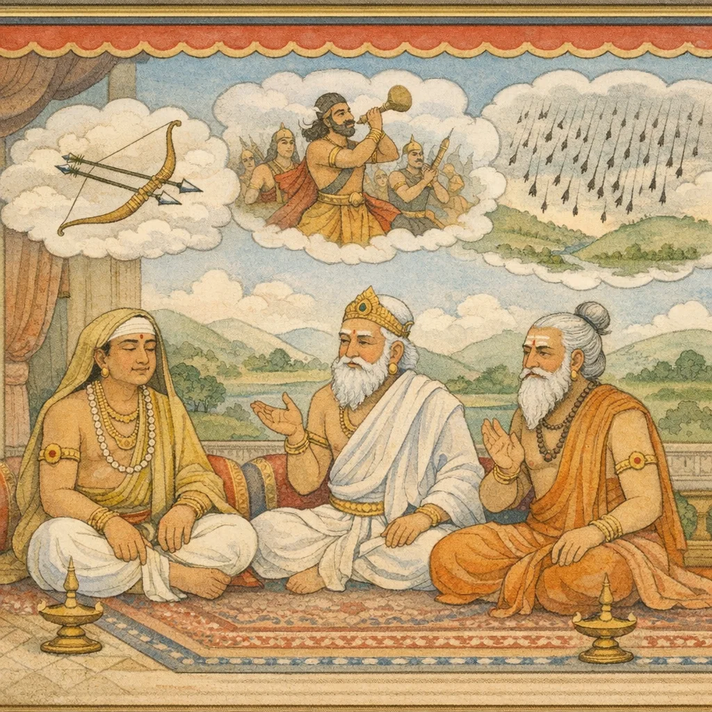 Chapter Arc: धृतराष्ट्र के वचनों को सुनकर भीष्म और द्रोण—जो आने वाले जनसंहार की आशंका से भीतर-ही-भीतर समान दुःख से दग्ध हैं—राजसभा में गुरुजनों की भाँति गंभीर, हितकारी वाणी उठाते हैं। → वे युद्ध को ‘वैशसम्’ (महाविनाश) कहकर बार-बार टालने की प्रार्थना करते हैं और ‘यावत्… तावत् श्याम्यतु वैशसम्’ की ध्वनि में पाण्डव-सेना के क्रमशः उभरते चित्र खींचते हैं—कृष्ण-अर्जुन के कवचधारी होने तक, गाण्डीव के उठने तक, धौम्य के यज्ञाग्नि में शत्रुबल के विनाश हेतु आहुति देने तक, युधिष्ठिर के क्रुद्ध होकर सेना देखने तक, भीम के अग्रभाग में खड़े होने तक, और नकुल-सहदेव, धृष्टद्युम्न, विराट, शिखण्डी आदि के समुद्र में ‘मकर/नक्र’ की तरह प्रवेश करने तक। → वाणी का शिखर उस भयावह भविष्यचित्र में आता है जहाँ भीम की गदा से गजारोही योद्धा ‘काल से परिपक्व फलों’ की तरह धराशायी होंगे और ‘गार्ध्रपत्र’ (गीध-पंखों जैसे) उग्र बाण कोमल देहों पर बरसेंगे—युद्ध का सौंदर्य नहीं, उसका नृशंस सत्य सामने रखकर वे धृतराष्ट्र को झकझोरते हैं। → भीष्म-द्रोण का निष्कर्ष स्पष्ट है: अभी, जब तक ये संकेत घटित नहीं हुए, विनाश को शांत किया जा सकता है; अतः संधि, संयम और नीति से युद्ध रोका जाए—क्योंकि एक बार कृष्ण-अर्जुन और पाण्डव-वीर पूर्णतः उद्यत हो गए तो रोकना असंभव होगा। → धृतराष्ट्र इस गुरु-वाणी को स्वीकार कर युद्ध-निवारण की ओर मुड़ेंगे, या पुत्रमोह/दुर्योधन-आश्रय में विनाश की ओर ही बढ़ेंगे?