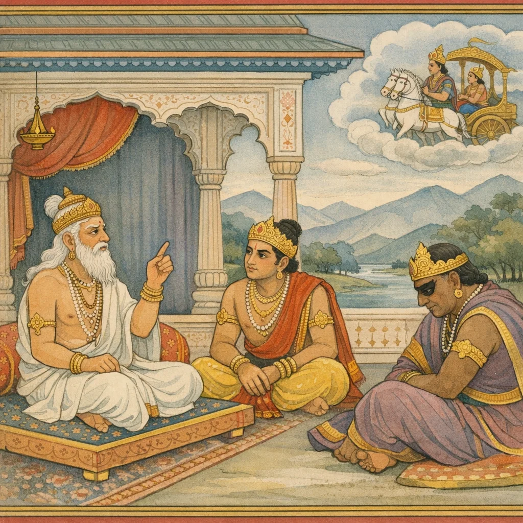 Chapter Arc: धृतराष्ट्र के दरबार में युद्ध की गणना-भाषा गूंजती है—दुर्योधन जानना चाहता है कि उसके और शत्रु-पक्ष के रथी-अतिरथी कौन हैं, कितने हैं, और किस पर भरोसा रखा जाए। → भीष्म, अपनी कीर्ति का बखान किए बिना, कौरव-पक्ष के प्रमुख योद्धाओं का परिचय और उनकी श्रेणियाँ बताते हुए सेना के आत्मविश्वास को साधते हैं; साथ ही पाण्डव-पक्ष की शक्ति का संकेत भी देते हैं—विशेषतः अर्जुन का दृढ़ धनुष और वासुदेव-कृष्ण का साथ, जिसे सुनकर विजय की आशा के भीतर भय की लहर उठती है। → अर्जुन की प्रतिज्ञा और कृष्ण-सहायता का स्मरण युद्ध-गणना को अचानक ‘भाग्य-गणना’ बना देता है—भीष्म की वाणी में यह स्वीकार झलकता है कि जहाँ पार्थ के साथ वासुदेव हैं, वहाँ कौरवों के लिए ‘हतमेव’ का साया मंडराता है; फिर भी वे शास्त्र-विधि से सेना-रक्षा का व्रत लेते हैं। → भीष्म दुर्योधन के प्रश्न का उत्तर ‘व्यवस्था’ में बदल देते हैं—रथियों/अतिरथियों की पहचान, क्रम, और नियुक्ति का संकेत देकर मानसिक ज्वर शांत करने का आश्वासन देते हैं: वे तत्त्वतः युद्ध करेंगे और कौरव-वाहिनी की रक्षा करेंगे। → नियुक्ति और गणना पूरी होते ही प्रश्न शेष रह जाता है—क्या संख्या और श्रेणी, कृष्ण-युक्त पार्थ के सामने टिक पाएगी, और कौन-सा ‘पुराना वैर’ (जैसे जयद्रथ का) अगले अध्यायों में रक्त बनकर फूटेगा?
