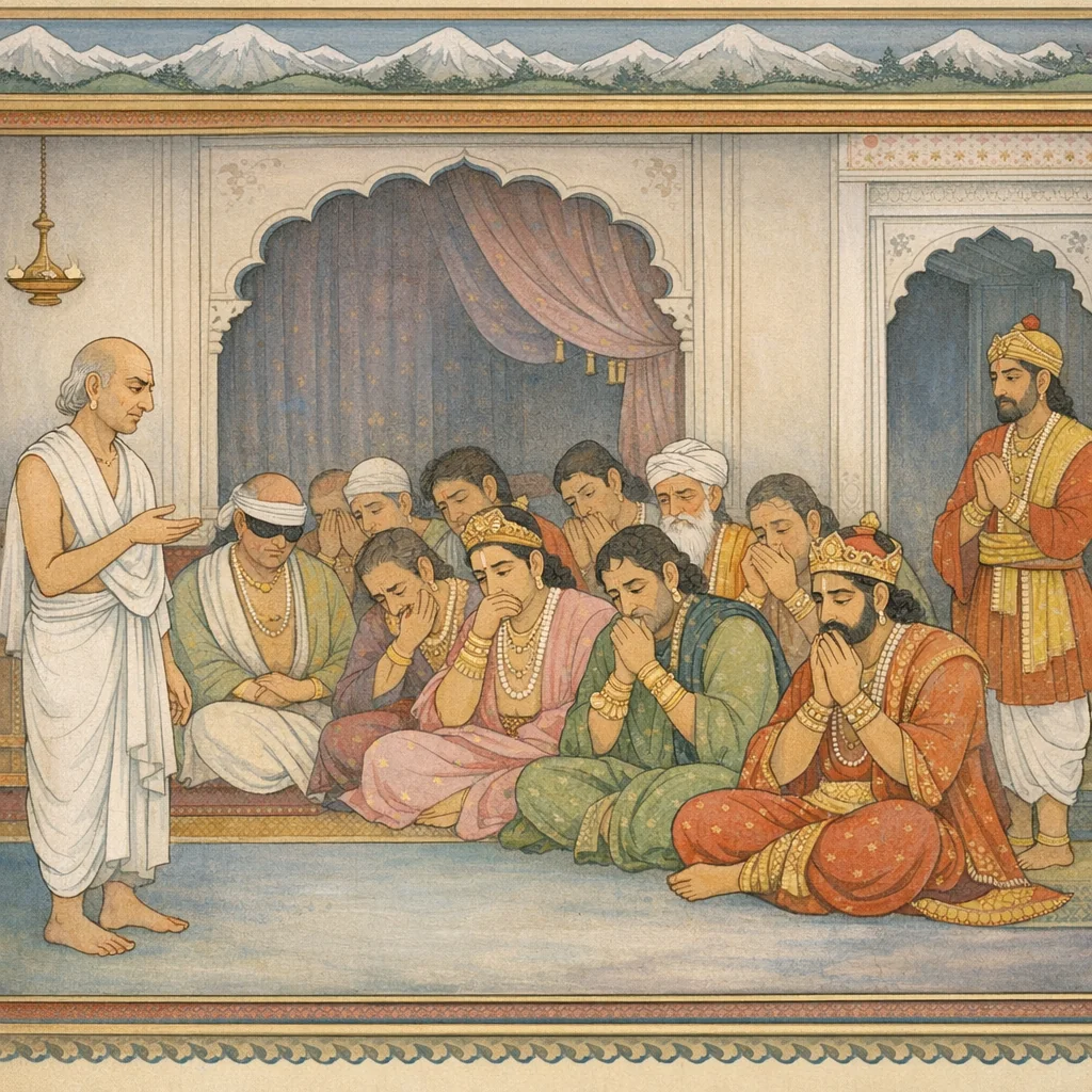 Chapter Arc: संजय के वचनों के प्रत्युत्तर में श्रीकृष्ण का स्वर कठोर हो उठता है—वे धृतराष्ट्र के लिए चेतावनी बनकर कहते हैं कि पाण्डवों की अविनाशिता और धर्म-बल को हल्के में लेना विनाश को बुलाना है। → कृष्ण धृतराष्ट्र-पुत्रों की लोभ-ग्रस्तता और सभा की कायर चुप्पी को उघाड़ते हैं: युधिष्ठिर का शम (क्षमा-शान्ति) ‘सुदुष्कर’ होते हुए भी प्रदर्शित हुआ, फिर भी धृतराष्ट्र सपरिवार गृद्ध (लालची) बना रहा—ऐसे में कलह क्यों न भड़के? वे संकेत करते हैं कि यदि पाण्डव पितृ-धर्म निभाते हुए भी दिष्टवश मृत्यु को प्राप्त हों, तो वह भी उनके लिए प्रशस्त निधन होगा—पर अधर्मियों के लिए नहीं। → सभा-धर्म का निर्णायक क्षण आता है: द्यूतकाले शकुनि की निकृष्ट वाणी और छल का स्मरण कराया जाता है, और बताया जाता है कि कैसे ‘कार्पण्य’ से ग्रस्त राजाओं ने प्रतिवचन न किया; केवल विदुर (क्षत्ता) ने धर्म्य अर्थ बोलकर अल्पबुद्धि को प्रत्युत्तर दिया। यही बिन्दु धृतराष्ट्र के राज्य में अधर्म के संस्थानीकरण का प्रमाण बनता है। → कृष्ण संजय के माध्यम से धृतराष्ट्र को अंतिम रूप से स्पष्ट करते हैं: पाण्डव शान्ति के लिए स्थिर हैं, सेवा-भाव से भी खड़े हैं, पर वे योद्धा भी समर्थ हैं—धृतराष्ट्र जो कर्तव्य चुनेगा, वही परिणाम का द्वार खोलेगा। क्षत्रिय-धर्म, प्रजा-रक्षा, दान-यज्ञ और धर्म-अध्ययन का स्मरण कराकर वे नीति का मार्ग दिखाते हैं। → धृतराष्ट्र क्या विदुर-वाणी और कृष्ण-चेतावनी को स्वीकार करेगा, या पुत्र-मोह और शकुनि-नीति के साथ चलकर युद्ध को अपरिहार्य बना देगा?