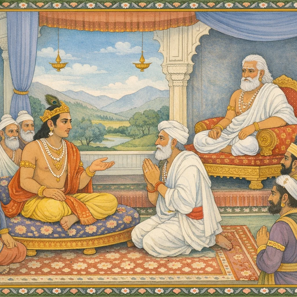 Chapter Arc: सभा के मध्य संजय को विदा करते हुए युधिष्ठिर धर्म और मर्यादा के साथ दूत-कार्य का आरम्भ कराते हैं—“अनुज्ञातः संजय स्वस्ति गच्छ”। → युधिष्ठिर संजय को विस्तृत संदेश सौंपते हैं: कृष्ण, भीम, अर्जुन, माद्रीसुत (नकुल/सहदेव), सात्यकि, चेकितान आदि का कुशल-समाचार; ब्राह्मण, तपस्वी, भिक्षु, वनवासी ऋषियों का अभिवादन; भीष्म जैसे कुरुवृद्धों के चरणों में निवेदन; और कुरु-युवाओं, पुत्र-पौत्रों, भ्राताओं तथा विविध दिशाओं के शूरवीरों का हाल पूछने की आज्ञा। → युधिष्ठिर का कठोरतम संदेश दुर्योधन के लिए उभरता है—उसकी देह-हृदय को जलाने वाली ‘कामना’ (कुरुओं को निष्पत्न करने की लालसा) को लक्ष्य कर चेतावनी: इस हठ की कोई युक्ति नहीं; या तो न्यायोचित अंश दे, या युद्ध के लिए प्रस्तुत हो। → संजय को स्पष्ट निर्देश मिलते हैं कि वह सबके प्रति शिष्टाचार निभाते हुए भीष्म-सभा और धृतराष्ट्र-दुर्योधन तक पांडवों का धर्मयुक्त, पर अडिग, पक्ष पहुँचा दे। → संजय हस्तिनापुर में यह संदेश सुनाएगा—पर क्या धृतराष्ट्र और दुर्योधन इसे स्वीकार करेंगे, या हठ युद्ध को अवश्यंभावी बना देगा?